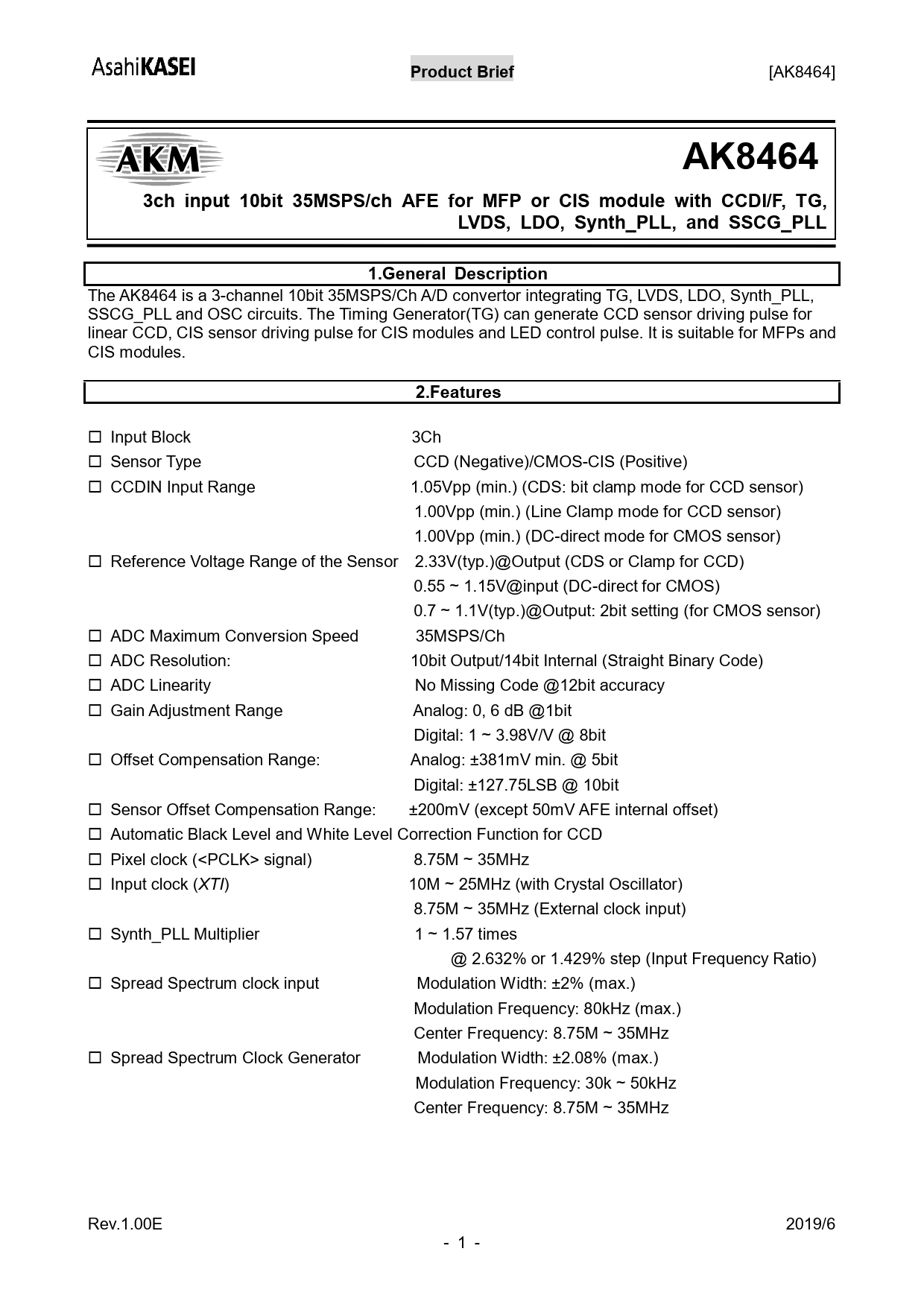 AK8464 3ch input 10bit 35MSPS/ch AFE for MFP or CIS module with CCDI/F, TG, LVDS, LDO, Synth_PLL, and SSCG_PLL 1.General Description