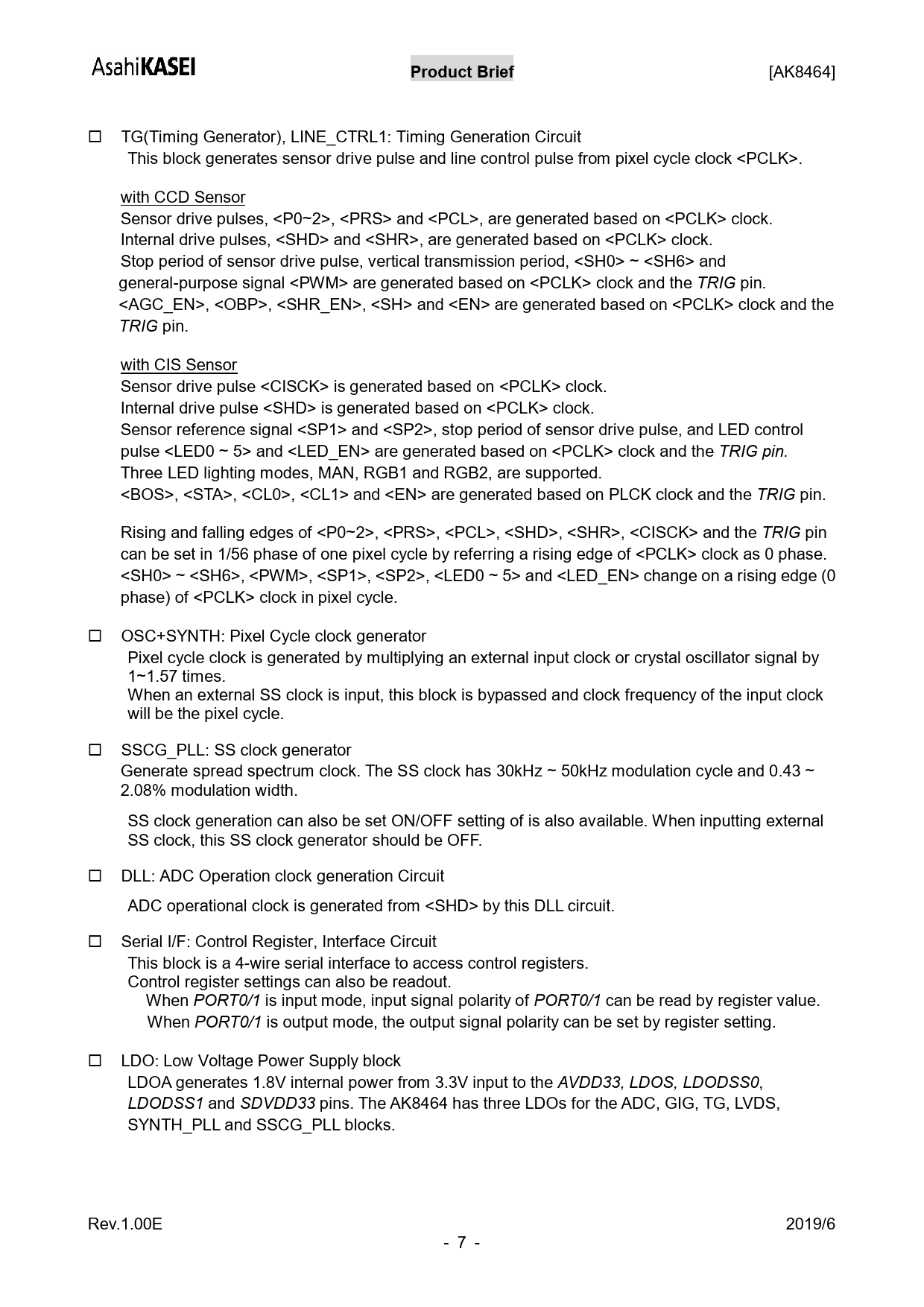 [AK8464]  TG(Timing Generator), LINE_CTRL1: Timing Generation Circuit This block generates sensor drive pulse and line control pulse from pixel cycle clock <PCLK>. with CCD Sensor Sensor drive pulses, <P0~2>, <PRS> and <PCL>, are generated based on <PCLK> clock. Internal drive pulses, <SHD> and <SHR>, are generated based on <PCLK> clock. Stop period of sensor drive pulse, vertical transmission period, <SH0> ~ <SH6> and general-purpose signal <PWM> are generated based on <PCLK> clock and the TRIG pin. <AGC_EN>, <OBP>, <SHR_EN>, <SH> and <EN> are generated based on <PCLK> clock and the TRIG pin. with CIS Sensor Sensor drive pulse <CISCK> is generated based on <PCLK> clock. Internal drive pulse <SHD> is generated based on <PCLK> clock. Sensor reference signal <SP1> and <SP2>, stop period of sensor drive pulse, and LED control pulse <LED0 ~ 5> and <LED_EN> are generated based on <PCLK> clock and the TRIG pin. Three LED lighting modes, MAN, RGB1 and RGB2, are supported. <BOS>, <STA>, <CL0>, <CL1> and <EN> are generated based on PLCK clock and the TRIG pin. Rising and falling edges of <P0~2>, <PRS>, <PCL>, <SHD>, <SHR>, <CISCK> and the TRIG pin can be set in 1/56 phase of one pixel cycle by referring a rising edge of <PCLK> clock as 0 phase. <SH0> ~ <SH6>, <PWM>, <SP1>, <SP2>, <LED0 ~ 5> and <LED_EN> change on a rising edge (0 phase) of <PCLK> clock in pixel cycle.  OSC+SYNTH: Pixel Cycle clock generator Pixel cycle clock is generated by multiplying an external input clock or crystal oscillator signal by 1~1.57 times. When an external SS clock is input, this block is bypassed and clock frequency of the input clock will be the pixel cycle.  SSCG_PLL: SS clock generator Generate spread spectrum clock. The SS clock has 30kHz ~ 50kHz modulation cycle and 0.43 ~ 2.08% modulation width. SS clock generation can also be set ON/OFF setting of is also available. When inputting external SS clock, this SS clock generator should be OFF.  DLL: ADC Operation clock generation Circuit ADC operational clock is generated from <SHD> by this DLL circuit.  Serial I/F: Control Register, Interface Circuit This block is a 4-wire serial interface to access control registers. Control register settings can also be readout. When PORT0/1 is input mode, input signal polarity of PORT0/1 can be read by register value. When PORT0/1 is output mode, the output signal polarity can be set by register setting.  LDO: Low Voltage Power Supply block LDOA generates 1.8V internal power from 3.3V input to the AVDD33, LDOS, LDODSS0, LDODSS1 and SDVDD33 pins. The AK8464 has three LDOs for the ADC, GIG, TG, LVDS, SYNTH_PLL and SSCG_PLL blocks. Rev.1.00E 2019/6 - 7 -