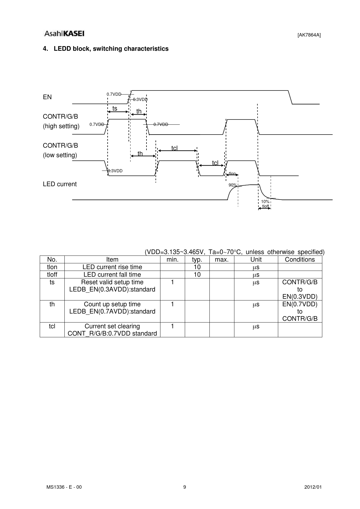 [AK7864A] 4. LEDD block, switching characteristics EN 0.7VDD 0.3VDD ts th CONTR/G/B (high setting) 0.7VDD 0.7VDD CONTR/G/B tcl (low setting) th tcl 0.3VDD tlon LED current 90% 10% tloff (VDD=3.135~3.465V, Ta=070C, unless otherwise specified) No. Item min. typ. max. Unit Conditions tlon LED current rise time 10 s tloff LED current fall time 10 s ts Reset valid setup time 1 s CONTR/G/B LEDB_EN(0.3AVDD):standard to EN(0.3VDD) th Count up setup time 1 s EN(0.7VDD) LEDB_EN(0.7AVDD):standard to CONTR/G/B tcl Current set clearing 1 s CONT_R/G/B:0.7VDD standard MS1336 - E - 00 9 2012/01