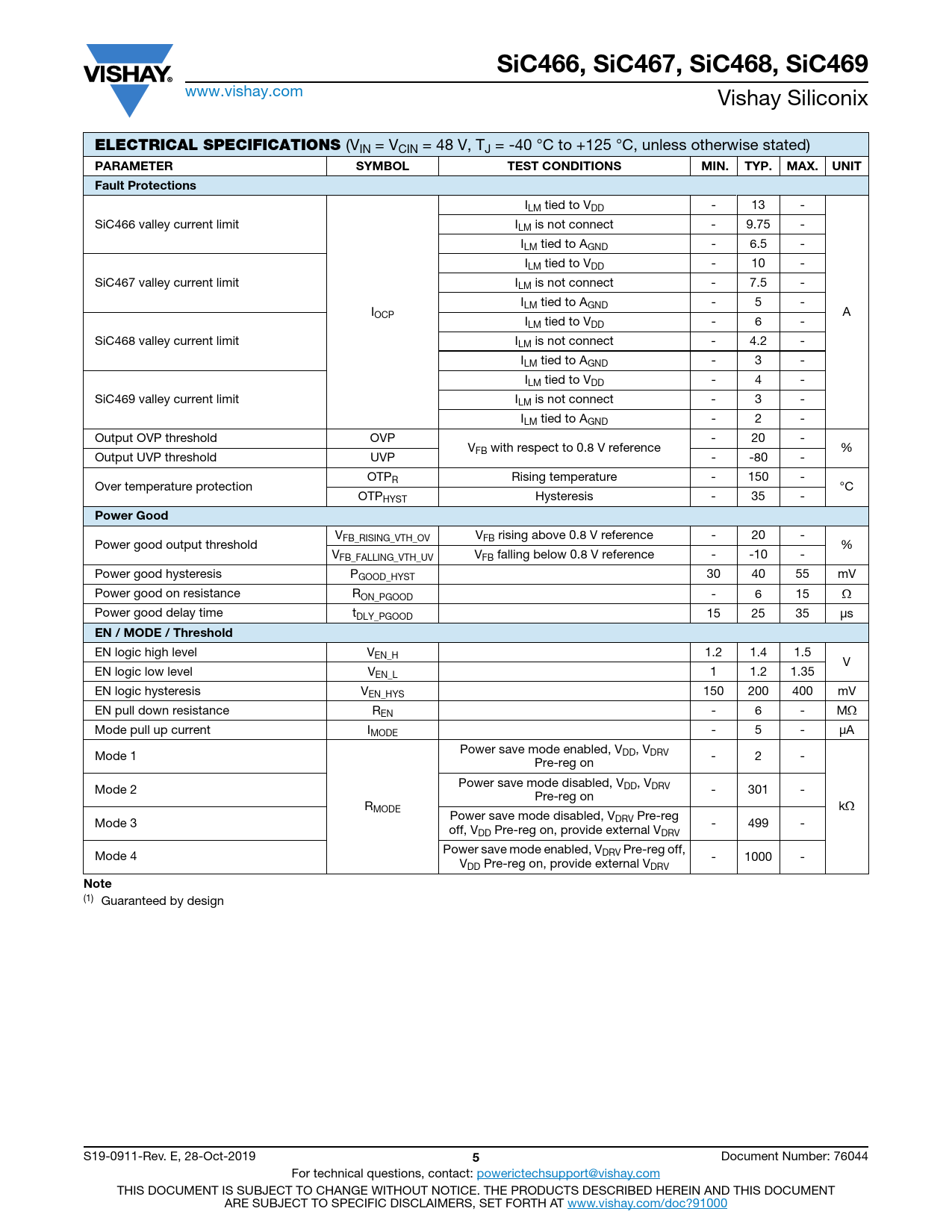 SiC466, SiC467, SiC468, SiC469. ELECTRICAL SPECIFICATIONS. PARAMETER SYMBOL. TEST. CONDITIONS. MIN. TYP. MAX. UNIT. Fault Protections
