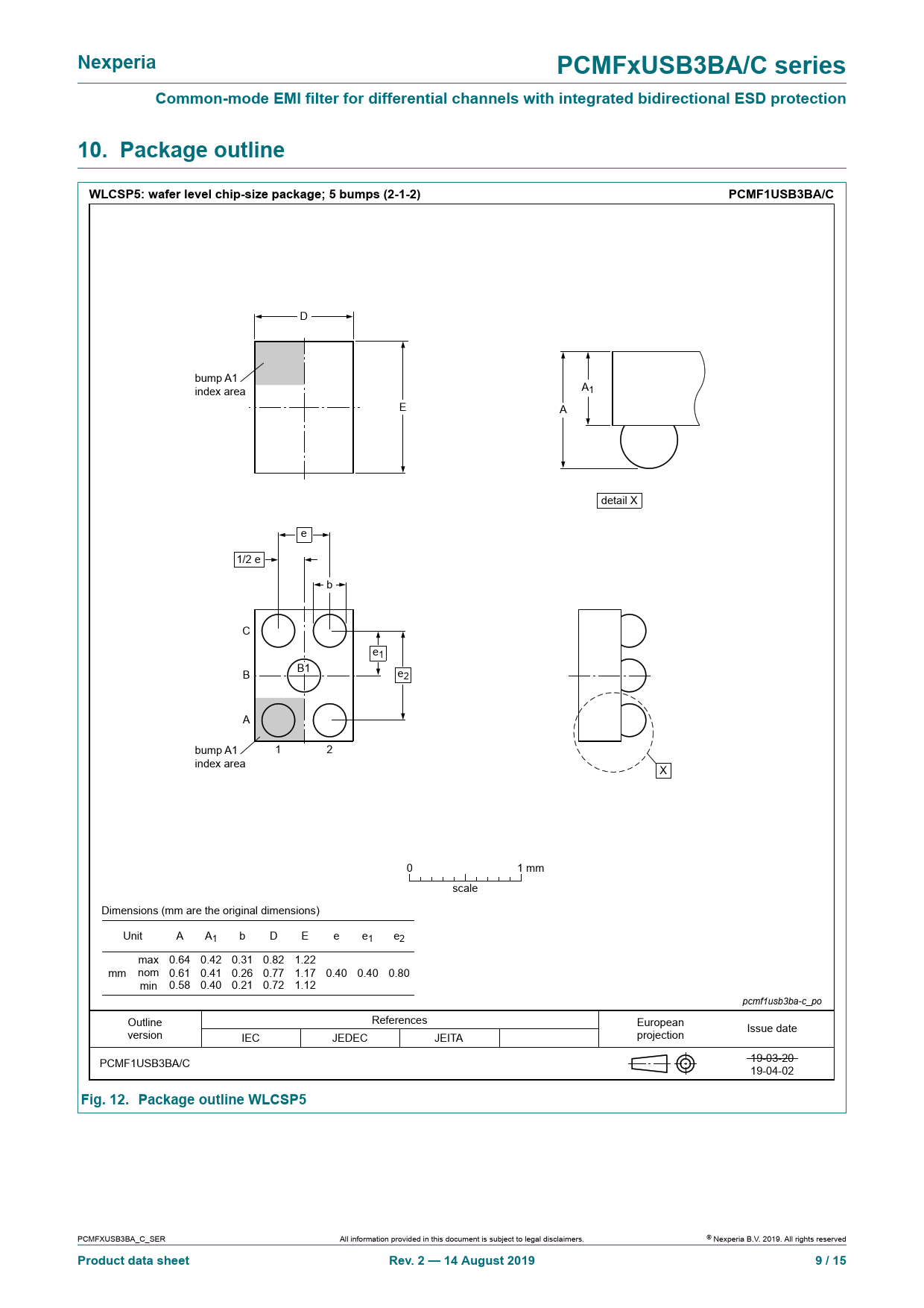 D bump A1 A index area 1 E A detail X e 1/2 e b C e1 B B1 e2 A bump A1 1 2 index area X 0 1 mm scale Dimensions (mm are the original dimensions) Unit A A1 b D E e e1 e2 max 0.64 0.42 0.31 0.82 1.22 mm nom 0.61 0.41 0.26 0.77 1.17 0.40 0.40 0.80 min 0.58 0.40 0.21 0.72 1.12 pcmf1usb3ba-c_po Outline References European version projection Issue date IEC JEDEC JEITA PCMF1USB3BA/C 19-03-20 19-04-02