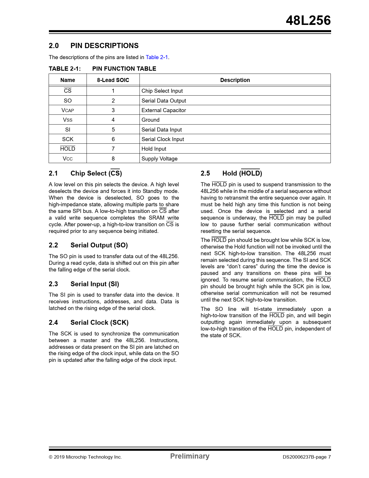 48L256. 2.0. PIN DESCRIPTIONS. TABLE 2-1:. PIN FUNCTION TABLE. Name. 8-Lead SOIC. Description. 2.1. Chip Select (CS). 2.5. Hold (HOLD). 2.2