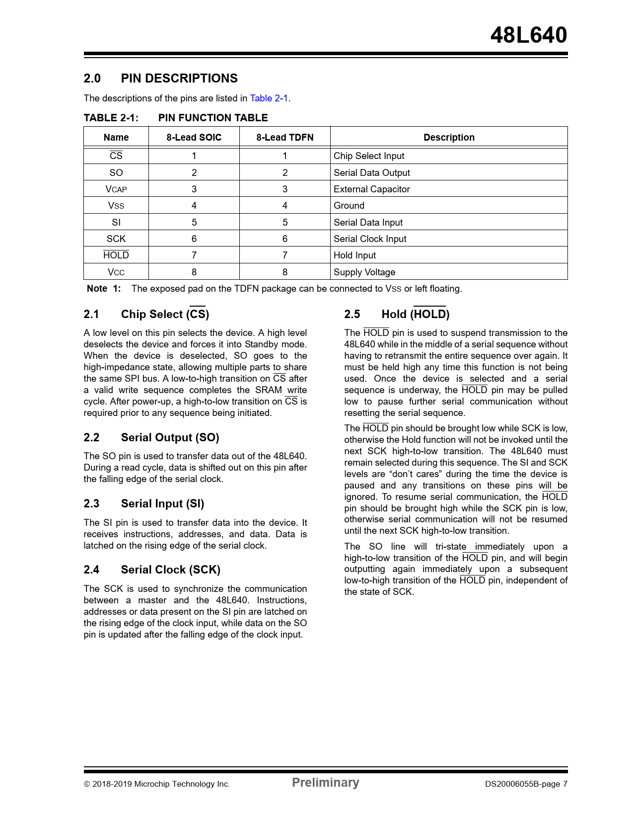 48L640. 2.0. PIN DESCRIPTIONS. TABLE 2-1:. PIN FUNCTION TABLE. Name. 8-Lead SOIC. 8-Lead TDFN. Description. Note 1:. 2.1. Chip Select (CS). 2.5