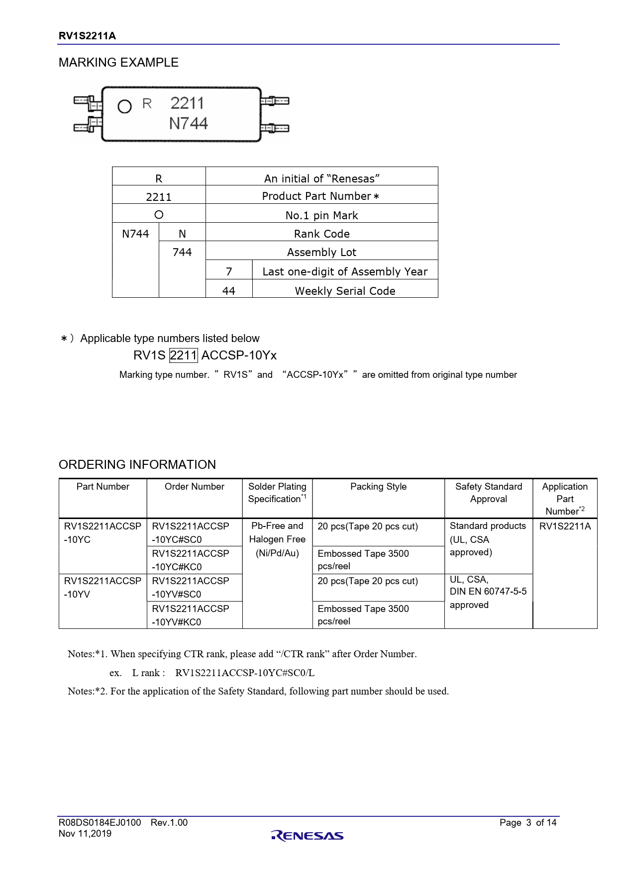 RV1S2211A 章題 MARKING EXAMPLE R An initial of “Renesas” 2211 Product Part Number* ○ No.1 pin Mark N744 N Rank Code 744 Assembly Lot 7 Last