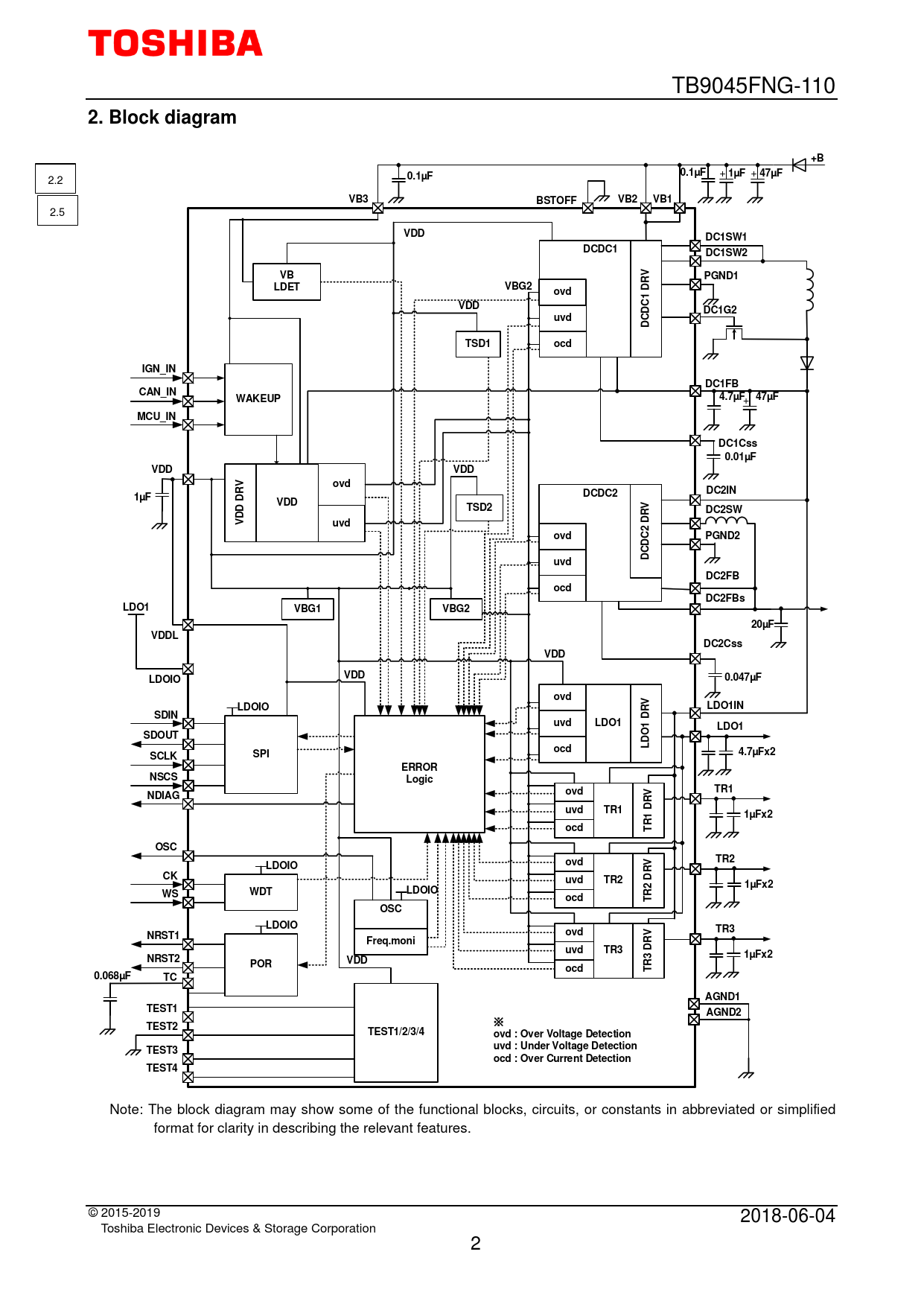Note: The block diagram may show some of the functional blocks, circuits, or constants in abbreviated or simplified format for clarity in describing the relevant features. © 2015-2019 2018-06-04 Toshiba Electronic Devices & Storage Corporation 2