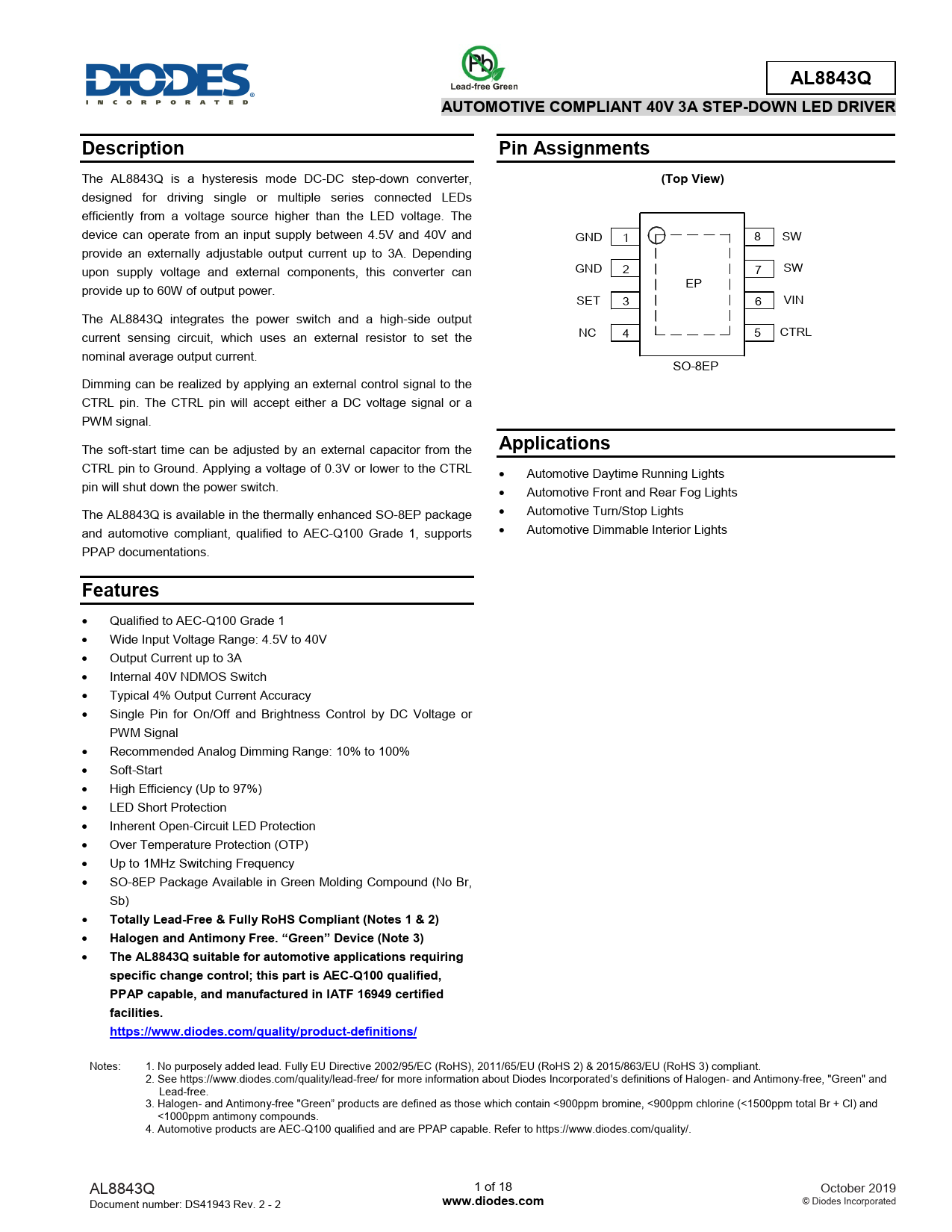 | Seiten / Seite | 18 / 1 — AL8843Q. AUTOMOTIVE COMPLIANT 40V 3A STEP-DOWN LE D DRIVER. Description. … |