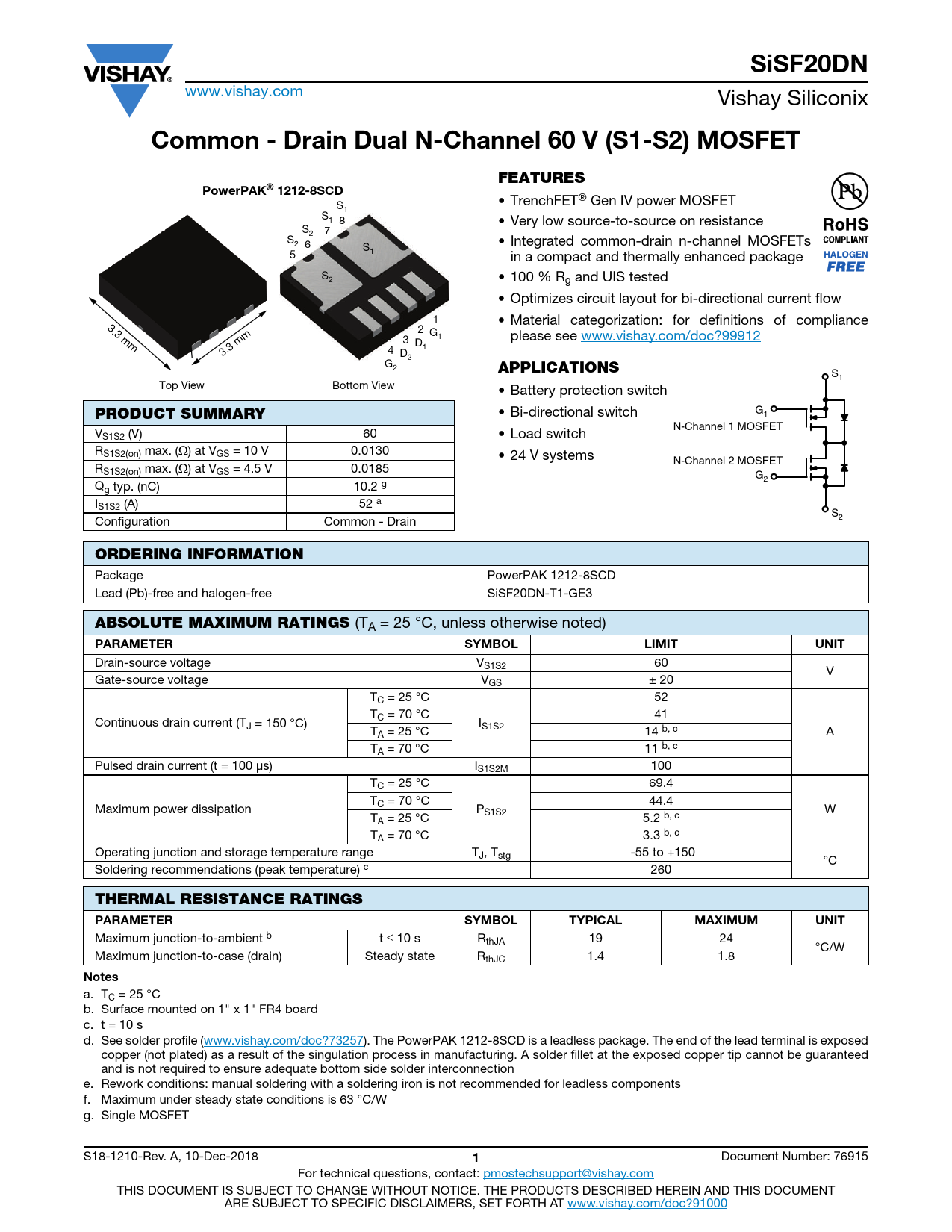 SiSF20DN www.vishay.com Vishay Siliconix Common - Drain Dual N-Channel 60 V (S1-S2) MOSFETFEATURESPowerPAK® 1212-8SCD • TrenchFET® Gen IV power MOSFET S1 S1 8 • Very low source-to-source on resistance S2 7 S2 6 • Integrated common-drain n-channel MOSFETs S 5 1 in a compact and thermally enhanced package S2 • 100 % Rg and UIS tested • Optimizes circuit layout for bi-directional current flow 1 • Material categorization: for definitions of compliance 3.3 mm 2 G1 please see www.vishay.com/doc?99912 3 D1 4 1 3.3 mm D2 G2 APPLICATIONS S1 Top View Bottom View • Battery protection switch PRODUCT SUMMARY • Bi-directional switch G1 N-Channel 1 MOSFET VS1S2 (V) 60 • Load switch RS1S2(on) max. () at VGS = 10 V 0.0130 • 24 V systems N-Channel 2 MOSFET RS1S2(on) max. () at VGS = 4.5 V 0.0185 G2 Qg typ. (nC) 10.2 g IS1S2 (A) 52 a S Configuration Common - Drain 2 ORDERING INFORMATION Package PowerPAK 1212-8SCD Lead (Pb)-free and halogen-free SiSF20DN-T1-GE3 ABSOLUTE MAXIMUM RATINGS (TA = 25 °C, unless otherwise noted) PARAMETERSYMBOL LIMITUNIT Drain-source voltage VS1S2 60 V Gate-source voltage VGS ± 20 TC = 25 °C 52 T Continuous drain current (T C = 70 °C 41 J = 150 °C) IS1S2 TA = 25 °C 14 b, c A TA = 70 °C 11 b, c Pulsed drain current (t = 100 μs) IS1S2M 100 TC = 25 °C 69.4 T Maximum power dissipation C = 70 °C 44.4 PS1S2 W TA = 25 °C 5.2 b, c TA = 70 °C 3.3 b, c Operating junction and storage temperature range TJ, Tstg -55 to +150 °C Soldering recommendations (peak temperature) c 260 THERMAL RESISTANCE RATINGSPARAMETERSYMBOL TYPICALMAXIMUMUNIT Maximum junction-to-ambient b t 10 s RthJA 19 24 °C/W Maximum junction-to-case (drain) Steady state RthJC 1.4 1.8 Notes a. TC = 25 °C b. Surface mounted on 1" x 1" FR4 board c. t = 10 s d. See solder profile (www.vishay.com/doc?73257). The PowerPAK 1212-8SCD is a leadless package. The end of the lead terminal is exposed copper (not plated) as a result of the singulation process in manufacturing. A solder fillet at the exposed copper tip cannot be guaranteed and is not required to ensure adequate bottom side solder interconnection e. Rework conditions: manual soldering with a soldering iron is not recommended for leadless components f. Maximum under steady state conditions is 63 °C/W g. Single MOSFET S18-1210-Rev. A, 10-Dec-2018 1 Document Number: 76915 For technical questions, contact: pmostechsupport@vishay.com THIS DOCUMENT IS SUBJECT TO CHANGE WITHOUT NOTICE. THE PRODUCTS DESCRIBED HEREIN AND THIS DOCUMENT ARE SUBJECT TO SPECIFIC DISCLAIMERS, SET FORTH AT www.vishay.com/doc?91000