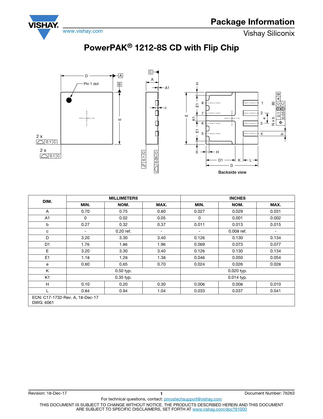Package Information. PowerPAK® 1212-8S CD with Flip Chip. Backside view. MILLIMETERS. INCHES. DIM. MIN. NOM. MAX