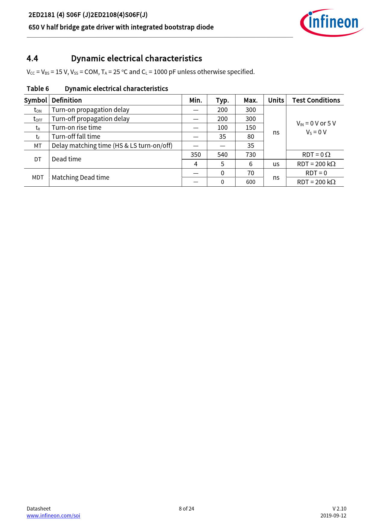 2ED2181 (4) S06F (J)2ED2108(4)S06F(J) 650 V half bridge gate driver with integrated bootstrap diode 4.4 Dynamic electrical characteristics VCC = VBS = 15 V, VSS = COM, TA = 25 oC and CL = 1000 pF unless otherwise specified. Table 6 Dynamic electrical characteristics Symbol Definition Min. Typ. Max. Units Test Conditions tON Turn-on propagation delay — 200 300 tOFF Turn-off propagation delay — 200 300 VIN = 0 V or 5 V tR Turn-on rise time — 100 150 ns VS = 0 V tF Turn-off fal time — 35 80 MT Delay matching time (HS & LS turn-on/off) — — 35 350 540 730 RDT = 0 Ω DT Dead time 4 5 6 us RDT = 200 kΩ — 0 70 RDT = 0 MDT Matching Dead time ns — 0 600 RDT = 200 kΩ Datasheet 8 of 24 V 2.10 www.infineon.com/soi 2019-09-12 Document Outline Features Product summary Potential applications Product validation Ordering information Description 1 Table of contents 2 Block diagram 3 Pin configuration and functionality 3.1 Pin configuration 3.2 Pin functionality 4 Electrical parameters 4.1 Absolute maximum ratings 4.2 Recommended operating conditions 4.3 Static electrical characteristics 4.4 Dynamic electrical characteristics 5 Application information and additional details 5.1 IGBT / MOSFET gate drive 5.2 Switching and timing relationships 5.3 Deadtime 5.4 Matched propagation delays 5.5 Input logic compatibility 5.6 Undervoltage lockout 5.7 Bootstrap diode 5.8 Calculating the bootstrap capacitance CBS 5.9 Tolerant to negative tranisents on input pins 5.10 Negative voltage transient tolerance of VS pin 5.11 NTSOA – Negative Transient Safe Operating Area 5.12 Higher headroom for input to output signal transmission with logic operation upto -11 V 5.13 Maximum switching frequency 5.14 PCB layout tips 6 Qualification information0F 7 Related products 8 Package details 9 Part marking information 10 Additional documentation and resources 10.1 Infineon online forum resources 11 Revision history