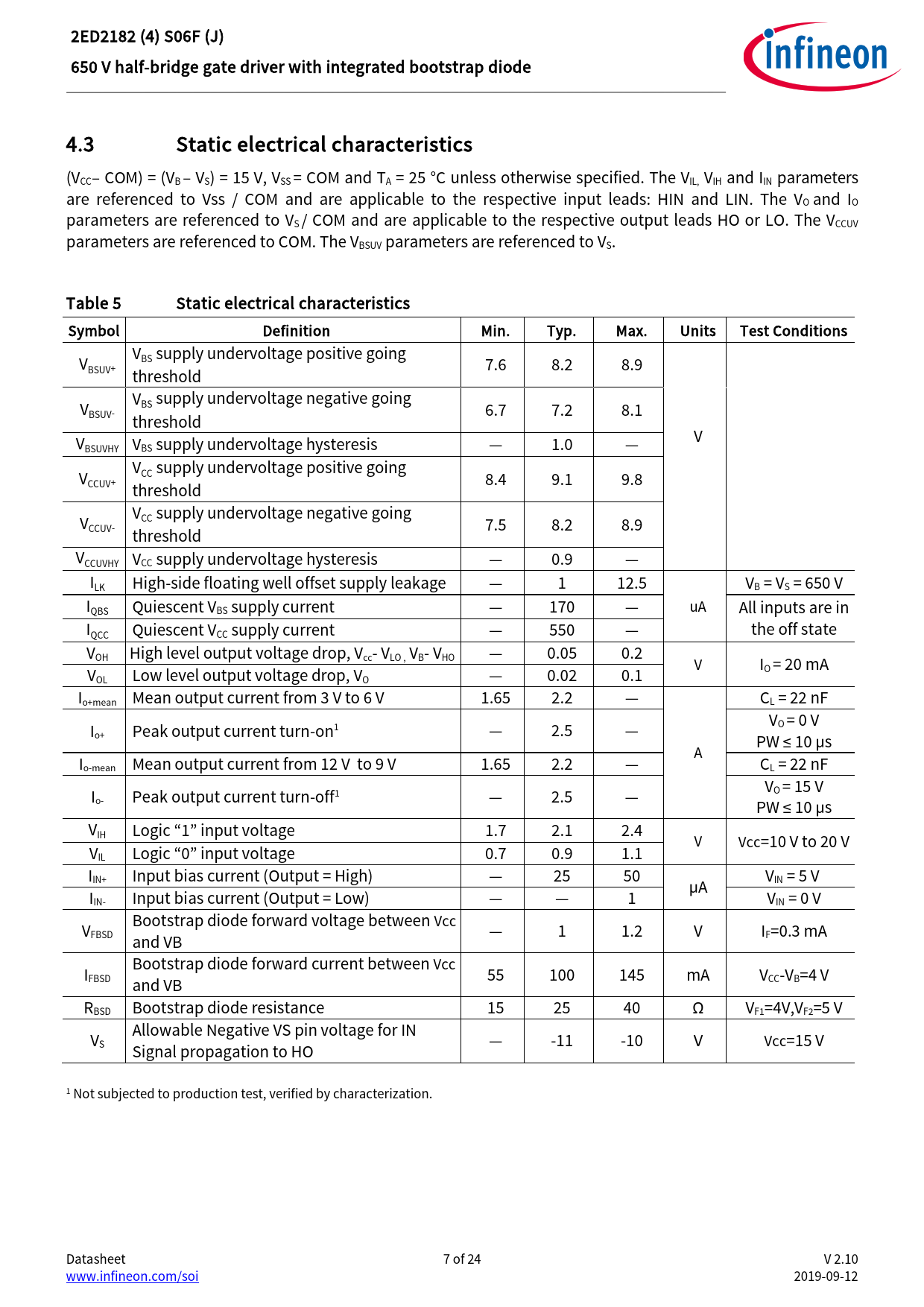 2ED2182 (4) S06F (J) 650 V half-bridge gate driver with integrated bootstrap diode 4.3 Static electrical characteristics (VCC– COM) = (VB – VS) = 15 V, VSS = COM and TA = 25 °C unless otherwise specified. The VIL, VIH and IIN parameters are referenced to Vss / COM and are applicable to the respective input leads: HIN and LIN. The VO and IO parameters are referenced to VS / COM and are applicable to the respective output leads HO or LO. The VCCUV parameters are referenced to COM. The VBSUV parameters are referenced to VS. Table 5 Static electrical characteristics Symbol Definition Min. Typ. Max. Units Test Conditions VBSUV+ VBS supply undervoltage positive going 7.6 8.2 8.9 threshold VBSUV- VBS supply undervoltage negative going 6.7 7.2 8.1 threshold V VBSUVHY VBS supply undervoltage hysteresis — 1.0 — VCCUV+ VCC supply undervoltage positive going 8.4 9.1 9.8 threshold VCCUV- VCC supply undervoltage negative going 7.5 threshold 8.2 8.9 VCCUVHY VCC supply undervoltage hysteresis — 0.9 — ILK High-side floating wel offset supply leakage — 1 12.5 VB = VS = 650 V IQBS Quiescent VBS supply current — 170 — uA All inputs are in IQCC Quiescent VCC supply current — 550 — the off state VOH High level output voltage drop, Vcc- VLO , VB- VHO — 0.05 0.2 V IO = 20 mA VOL Low level output voltage drop, VO — 0.02 0.1 Io+mean Mean output current from 3 V to 6 V 1.65 2.2 — CL = 22 nF Io+ Peak output current turn-on1 — 2.5 — VO = 0 V PW ≤ 10 µs A Io-mean Mean output current from 12 V to 9 V 1.65 2.2 — CL = 22 nF Io- Peak output current turn-off1 — 2.5 — VO = 15 V PW ≤ 10 µs VIH Logic “1” input voltage 1.7 2.1 2.4 V Vcc=10 V to 20 V VIL Logic “0” input voltage 0.7 0.9 1.1 IIN+ Input bias current (Output = High) — 25 50 V µA IN = 5 V IIN- Input bias current (Output = Low) — — 1 VIN = 0 V V Bootstrap diode forward voltage between Vcc FBSD and VB — 1 1.2 V I F=0.3 mA I Bootstrap diode forward current between Vcc FBSD and VB 55 100 145 mA V CC-VB=4 V RBSD Bootstrap diode resistance 15 25 40 Ω VF1=4V,VF2=5 V V Allowable Negative VS pin voltage for IN S Signal propagation to HO — -11 -10 V Vcc=15 V 1 Not subjected to production test, verified by characterization. Datasheet 7 of 24 V 2.10 www.infineon.com/soi 2019-09-12 Document Outline Features Product summary Product validation Description Summary of feature comparison of the 2ED218x family 1 Table of contents 2 Block diagram 3 Pin configuration and functionality 3.1 Pin configuration 3.2 Pin functionality 4 Electrical parameters 4.1 Absolute maximum ratings 4.2 Recommended operating conditions 4.3 Static electrical characteristics 4.4 Dynamic electrical characteristics 5 Application information and additional details 5.1 IGBT / MOSFET gate drive 5.2 Switching and timing relationships 5.3 Deadtime and matched propagation delays 5.4 Input logic compatibility 5.5 Undervoltage lockout 5.6 Bootstrap diode 5.7 Calculating the bootstrap capacitance CBS 5.8 Tolerant to negative tranisents on input pins 5.9 Negative voltage transient tolerance of VS pin 5.10 NTSOA – Negative Transient Safe Operating Area 5.11 Higher headroom for input to output signal transmission with logic operation upto -11 V 5.12 Maximum switching frequency 5.13 PCB layout tips 6 Qualification information0F 7 Related products 8 Package details 9 Part marking information 10 Additional documentation and resources 10.1 Infineon online forum resources 11 Revision history