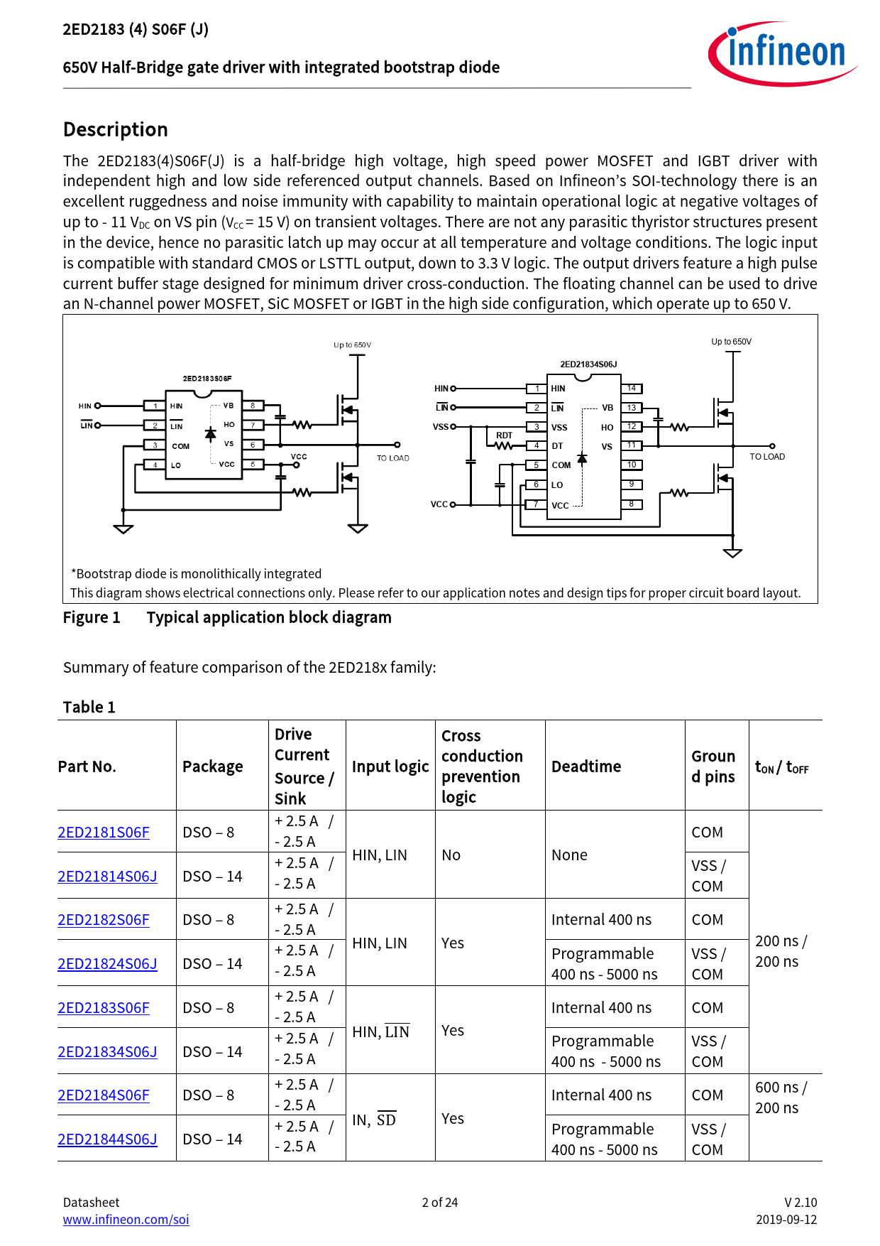 2ED2183 (4) S06F (J) 650V Half-Bridge gate driver with integrated bootstrap diode Description The 2ED2183(4)S06F(J) is a half-bridge high voltage, high speed power MOSFET and IGBT driver with independent high and low side referenced output channels. Based on Infineon’s SOI-technology there is an excel ent ruggedness and noise immunity with capability to maintain operational logic at negative voltages of up to - 11 VDC on VS pin (VCC = 15 V) on transient voltages. There are not any parasitic thyristor structures present in the device, hence no parasitic latch up may occur at all temperature and voltage conditions. The logic input is compatible with standard CMOS or LSTTL output, down to 3.3 V logic. The output drivers feature a high pulse current buffer stage designed for minimum driver cross-conduction. The floating channel can be used to drive an N-channel power MOSFET, SiC MOSFET or IGBT in the high side configuration, which operate up to 650 V. Up to 650V