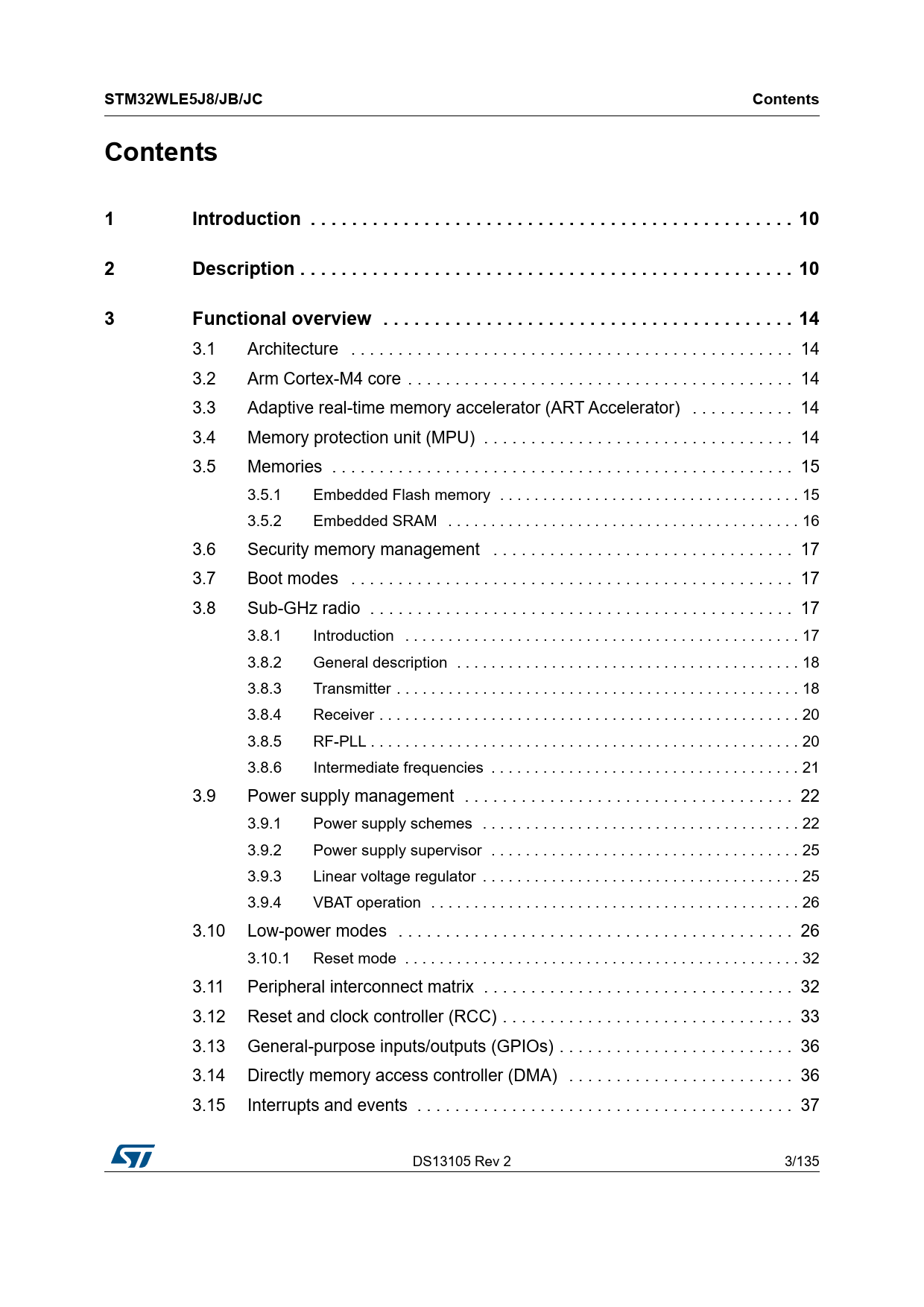 STM32WLE5J8/JB/JC Contents Contents 1 Introduction . 10 2 Description . 10 3 Functional overview . 14