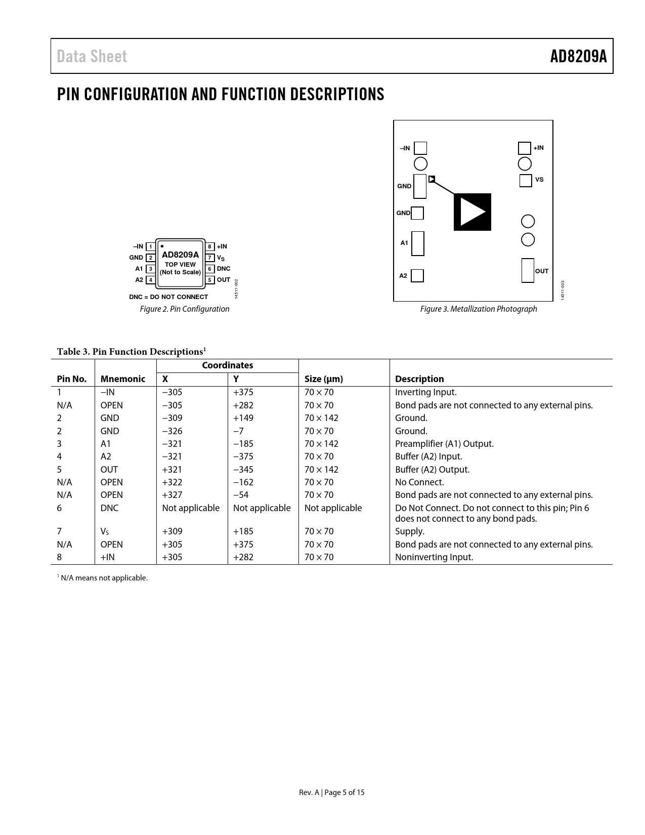 Seiten / Seite15 / 5 — Data Sheet. AD8209A. PIN CONFIGURATION AND FUNCTION DESCRIPTIONS. –IN. …