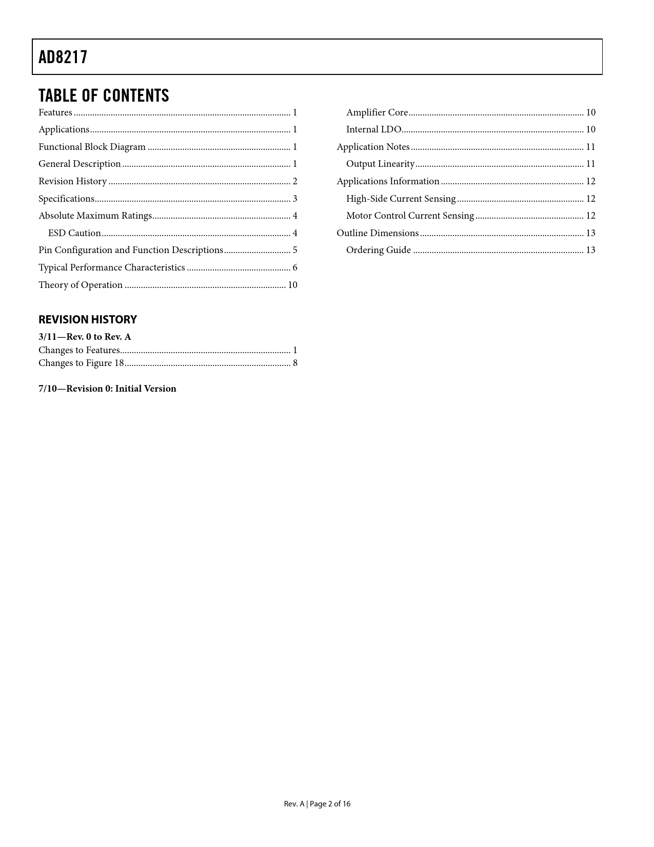 Seiten / Seite16 / 2 — AD8217. TABLE OF CONTENTS. REVISION HISTORY. 3/11—Rev. 0 to Rev. A. …