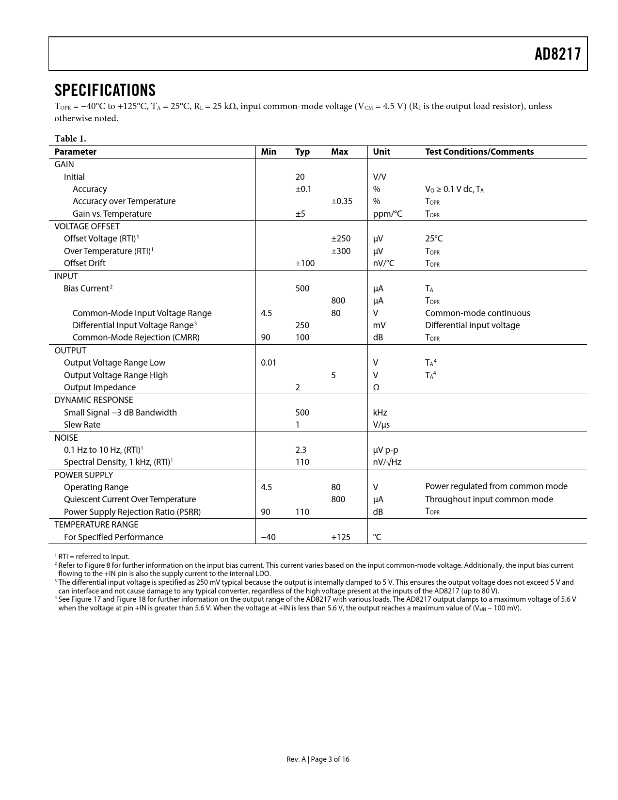 AD8217 SPECIFICATIONS Table 1 Parameter Min Typ Max Unit Test Conditions/Comments