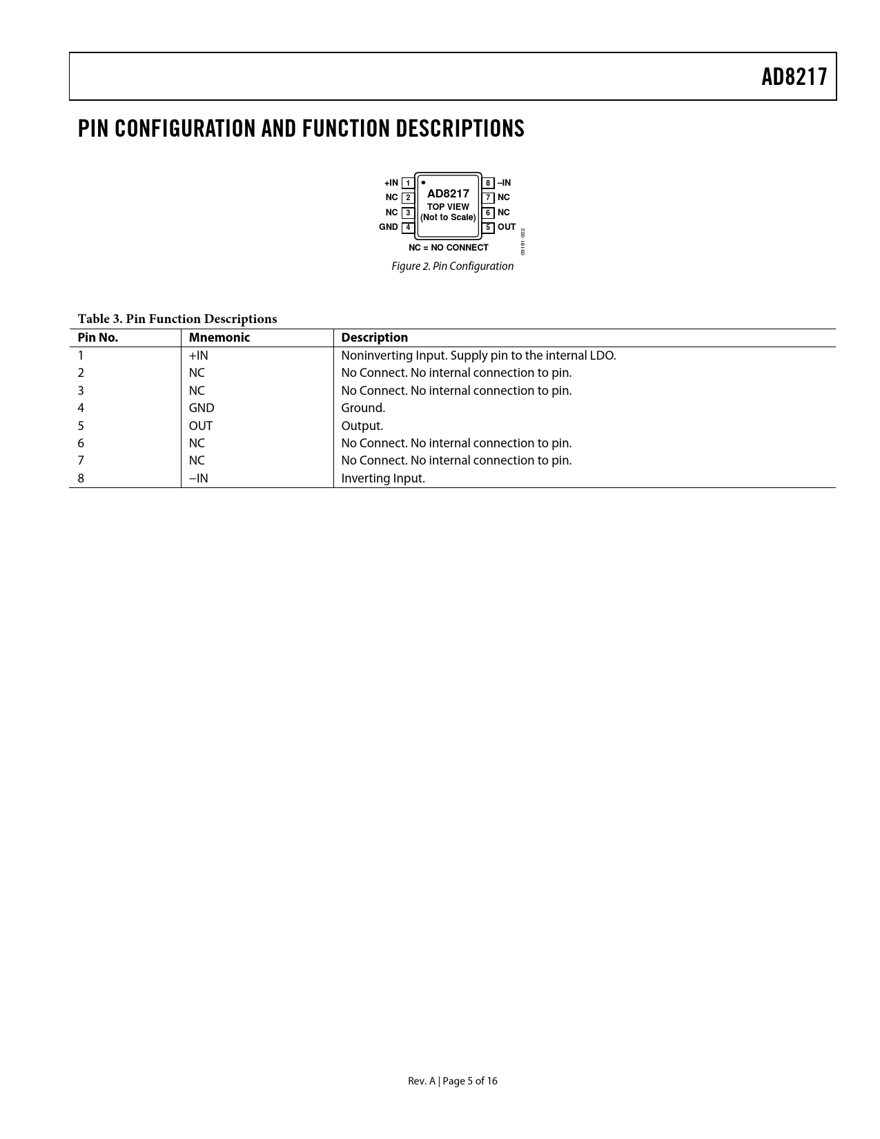 AD8217 PIN CONFIGURATION AND FUNCTION DESCRIPTIONS +IN 1 8 –IN NC AD8217 2 7 NC TOP VIEW NC 3 6 NC (Not to Scale) GND 4 5 OUT