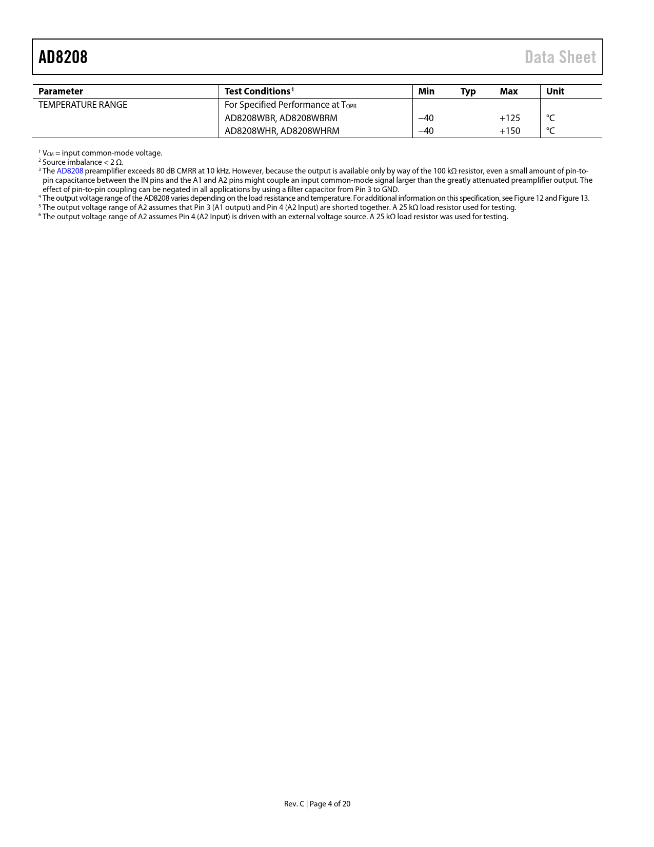 link to page 8 link to page 8 link to page 4 AD8208Data SheetParameterTest Conditions1MinTypMaxUnit TEMPERATURE RANGE For Specified Performance at TOPR AD8208WBR, AD8208WBRM −40 +125 °C AD8208WHR, AD8208WHRM −40 +150 °C 1 VCM = input common-mode voltage. 2 Source imbalance < 2 Ω. 3 The AD8208 preamplifier exceeds 80 dB CMRR at 10 kHz. However, because the output is available only by way of the 100 kΩ resistor, even a small amount of pin-to- pin capacitance between the IN pins and the A1 and A2 pins might couple an input common-mode signal larger than the greatly attenuated preamplifier output. The effect of pin-to-pin coupling can be negated in all applications by using a filter capacitor from Pin 3 to GND. 4 The output voltage range of the AD8208 varies depending on the load resistance and temperature. For additional information on this specification, see Figure 12 and Figure 13. 5 The output voltage range of A2 assumes that Pin 3 (A1 output) and Pin 4 (A2 Input) are shorted together. A 25 kΩ load resistor used for testing. 6 The output voltage range of A2 assumes Pin 4 (A2 Input) is driven with an external voltage source. A 25 kΩ load resistor was used for testing. Rev. C | Page 4 of 20 Document Outline Features Applications Functional Block Diagram General Description Revision History Specifications Absolute Maximum Ratings ESD Caution Pin Configuration and Function Descriptions Typical Performance Characteristics Theory of Operation Applications Information High-Side Current Sensing with a Low-Side Switch High-Rail Current Sensing Low-Side Current Sensing 4 mA to 20 mA Current Loop Receiver Gain Adjustment Gains Less than 20 Gains Greater than 20 Gain Trim Internal Signal Overload Considerations Low-Pass Filtering High Line Current Sensing with LPF and Gain Adjustment Outline Dimensions Ordering Guide Automotive Products