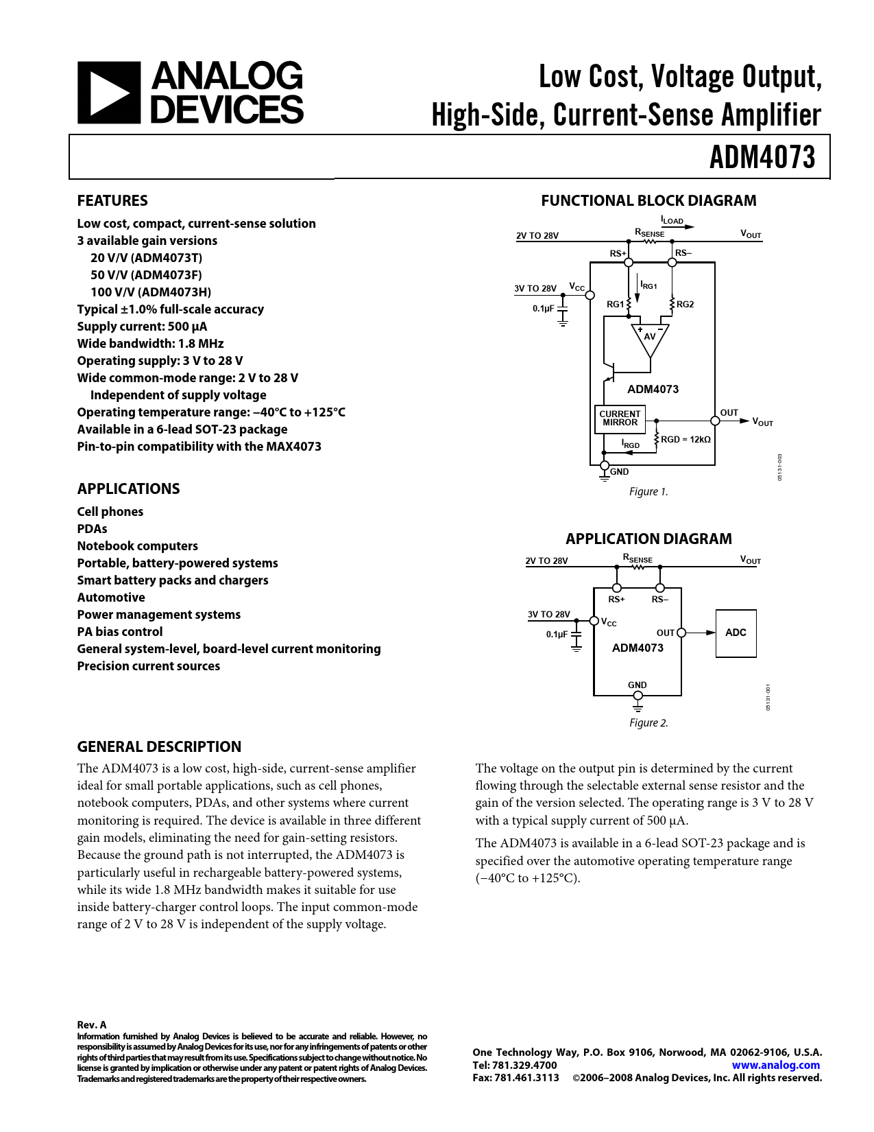 Low Cost, Voltage Output,. High-Side, Current-Sense Amplifier. ADM4073. FEATURES. FUNCTIONAL BLOCK DIAGRAM