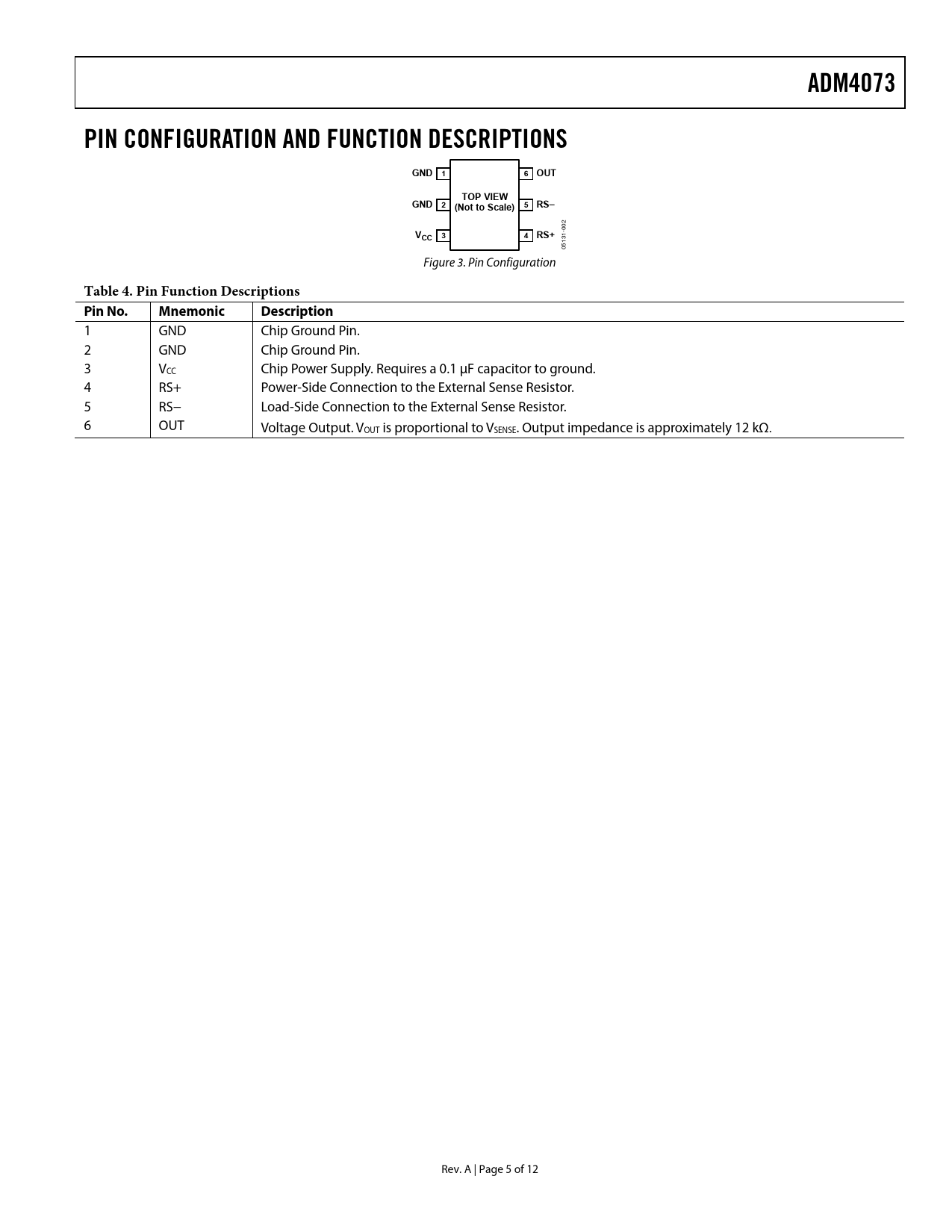 ADM4073. PIN CONFIGURATION AND FUNCTION DESCRIPTIONS. GND 1. 6 OUT. TOP VIEW. GND 2. 5 RS–. (Not to Scale). VCC 3. 4 RS+