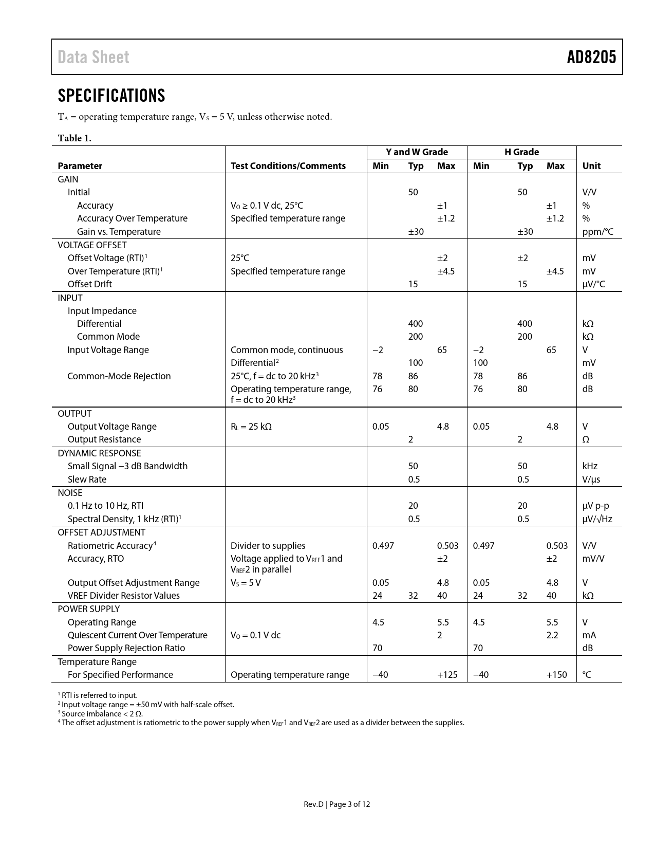 Data Sheet. AD8205. SPECIFICATIONS. Table 1. Y and W Grade. H Grade. Parameter. Test Conditions/Comments. Min. Typ. Max. Unit