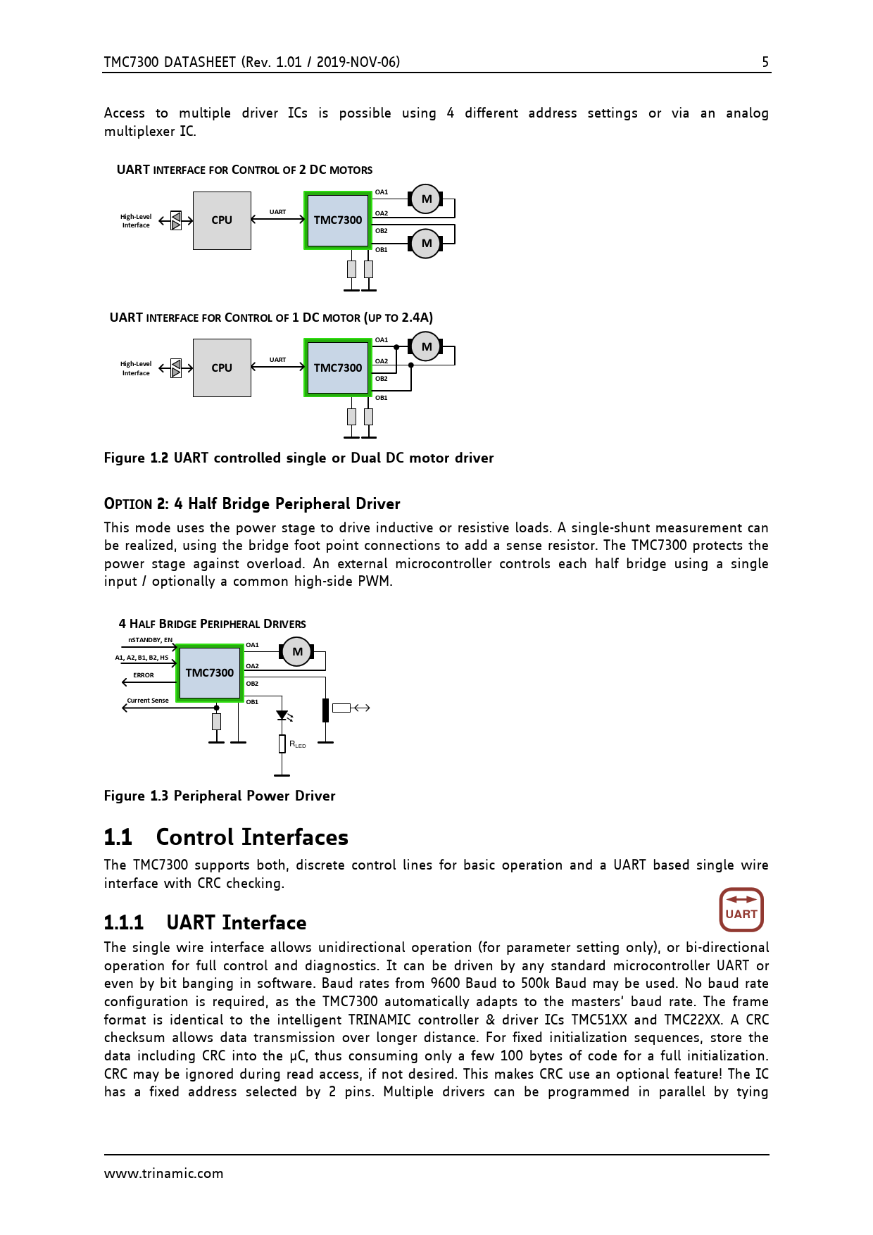TMC7300 DATASHEET (Rev. 1.01 / 2019-NOV-06) 5 Access to multiple driver ICs is possible using 4 different address settings or via an analog multiplexer IC. UART INTERFACE FOR CONTROL OF 2 DC MOTORSOA1MUARTOA2High-LevelCPUTMC7300InterfaceOB2MOB1UART INTERFACE FOR CONTROL OF 1 DC MOTOR (UP TO 2.4A)OA1MUARTOA2High-LevelCPUTMC7300InterfaceOB2OB1Figure 1.2 UART controlled single or Dual DC motor driverOPTION 2: 4 Half Bridge Peripheral Driver This mode uses the power stage to drive inductive or resistive loads. A single-shunt measurement can be realized, using the bridge foot point connections to add a sense resistor. The TMC7300 protects the power stage against overload. An external microcontroller controls each half bridge using a single input / optionally a common high-side PWM. 4 HALF BRIDGE PERIPHERAL DRIVERSnSTANDBY, ENOA1MA1, A2, B1, B2, HSOA2ERRORTMC7300OB2Current SenseOB1 RLED Figure 1.3 Peripheral Power Driver1.1 Control Interfaces The TMC7300 supports both, discrete control lines for basic operation and a UART based single wire interface with CRC checking. 1.1.1 UART InterfaceUART The single wire interface allows unidirectional operation (for parameter setting only), or bi-directional operation for full control and diagnostics. It can be driven by any standard microcontroller UART or even by bit banging in software. Baud rates from 9600 Baud to 500k Baud may be used. No baud rate configuration is required, as the TMC7300 automatically adapts to the masters’ baud rate. The frame format is identical to the intelligent TRINAMIC controller & driver ICs TMC51XX and TMC22XX. A CRC checksum allows data transmission over longer distance. For fixed initialization sequences, store the data including CRC into the µC, thus consuming only a few 100 bytes of code for a full initialization. CRC may be ignored during read access, if not desired. This makes CRC use an optional feature! The IC has a fixed address selected by 2 pins. Multiple drivers can be programmed in parallel by tying www.trinamic.com