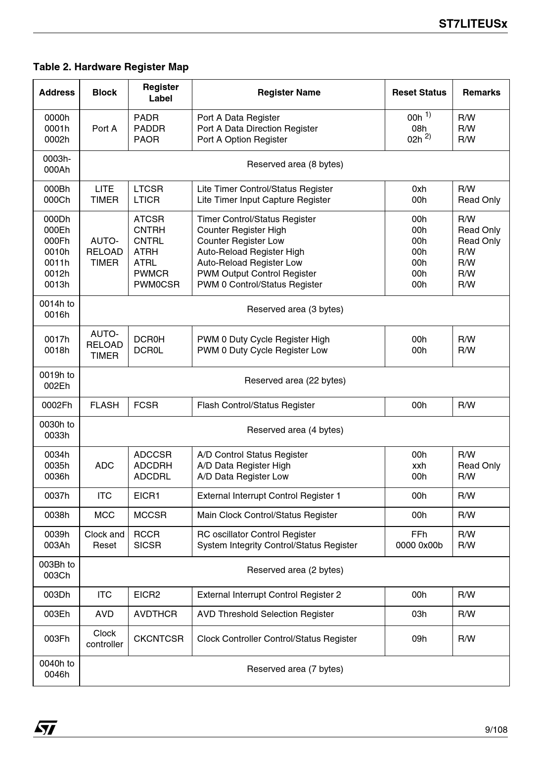 ST7LITEUSx. Table 2. Hardware Register Map. Register. Address. Block. Register Name. Reset Status. Remarks. Label