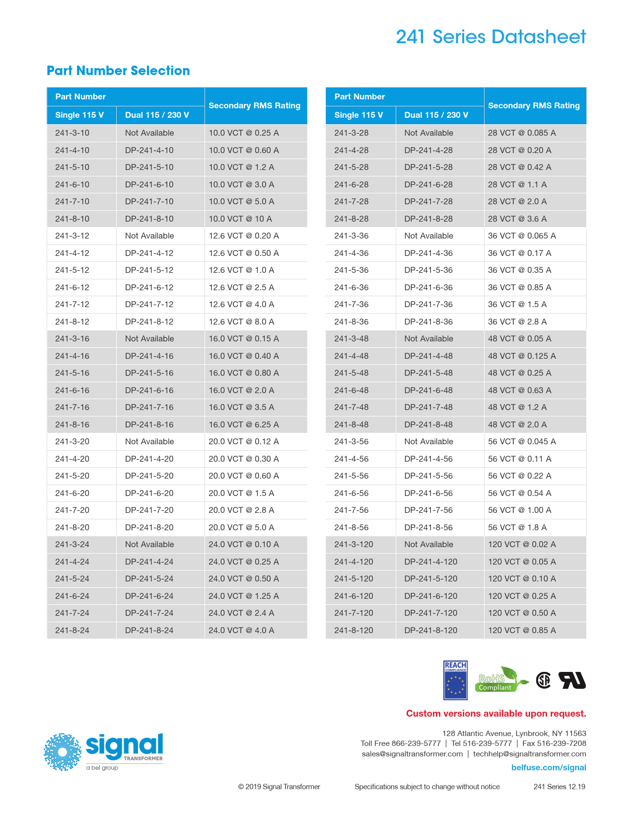 © 2019 Signal Transformer Specifications subject to change without notice 241 Series 12.19