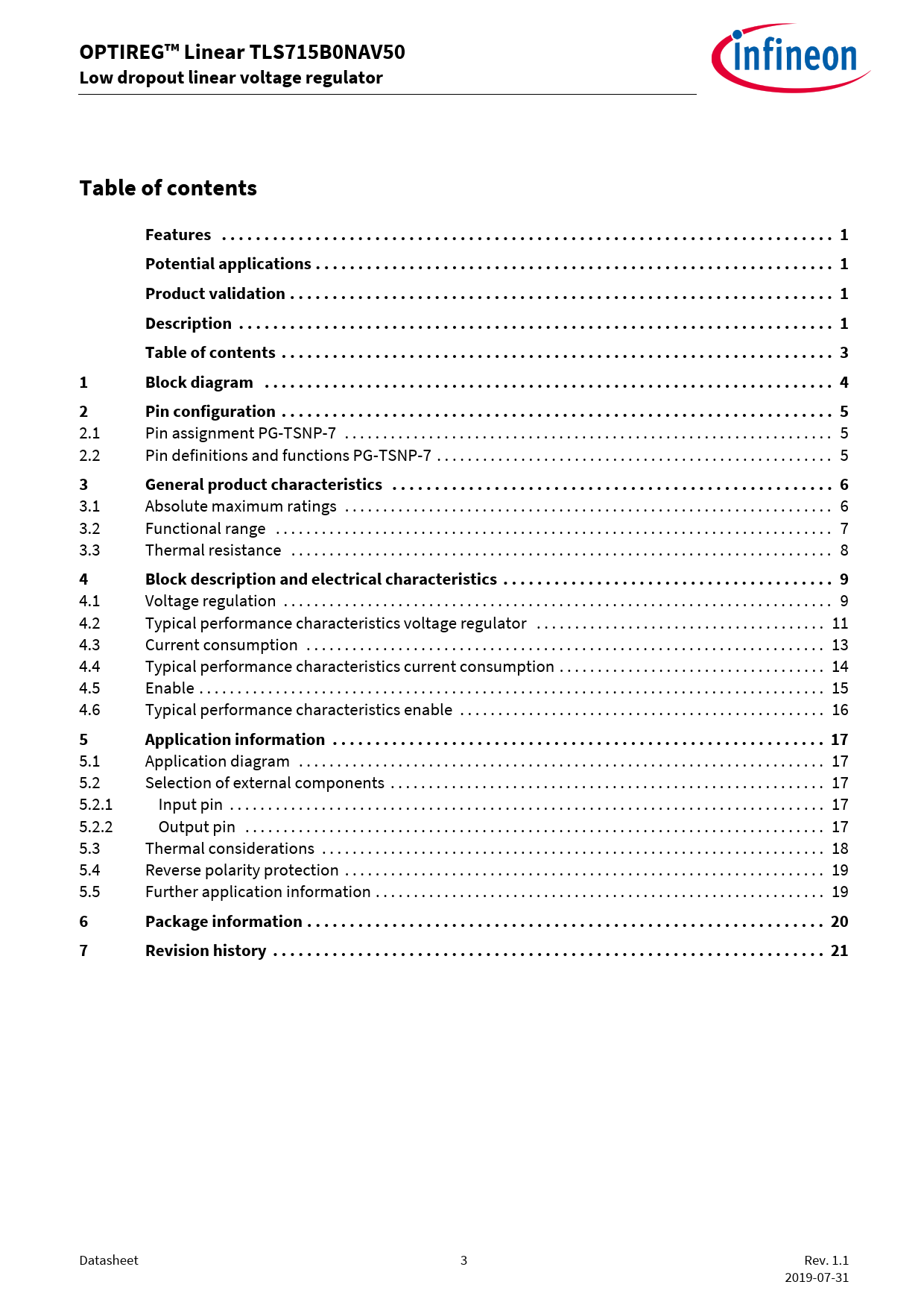 Datasheet 3 Rev. 1.1 2019-07-31 Document Outline Features Potential applications Product validation Description Table of contents 1 Block diagram 2 Pin configuration 2.1 Pin assignment PG-TSNP-7 2.2 Pin definitions and functions PG-TSNP-7 3 General product characteristics 3.1 Absolute maximum ratings 3.2 Functional range 3.3 Thermal resistance 4 Block description and electrical characteristics 4.1 Voltage regulation 4.2 Typical performance characteristics voltage regulator 4.3 Current consumption 4.4 Typical performance characteristics current consumption 4.5 Enable 4.6 Typical performance characteristics enable 5 Application information 5.1 Application diagram 5.2 Selection of external components 5.2.1 Input pin 5.2.2 Output pin 5.3 Thermal considerations 5.4 Reverse polarity protection 5.5 Further application information 6 Package information 7 Revision history