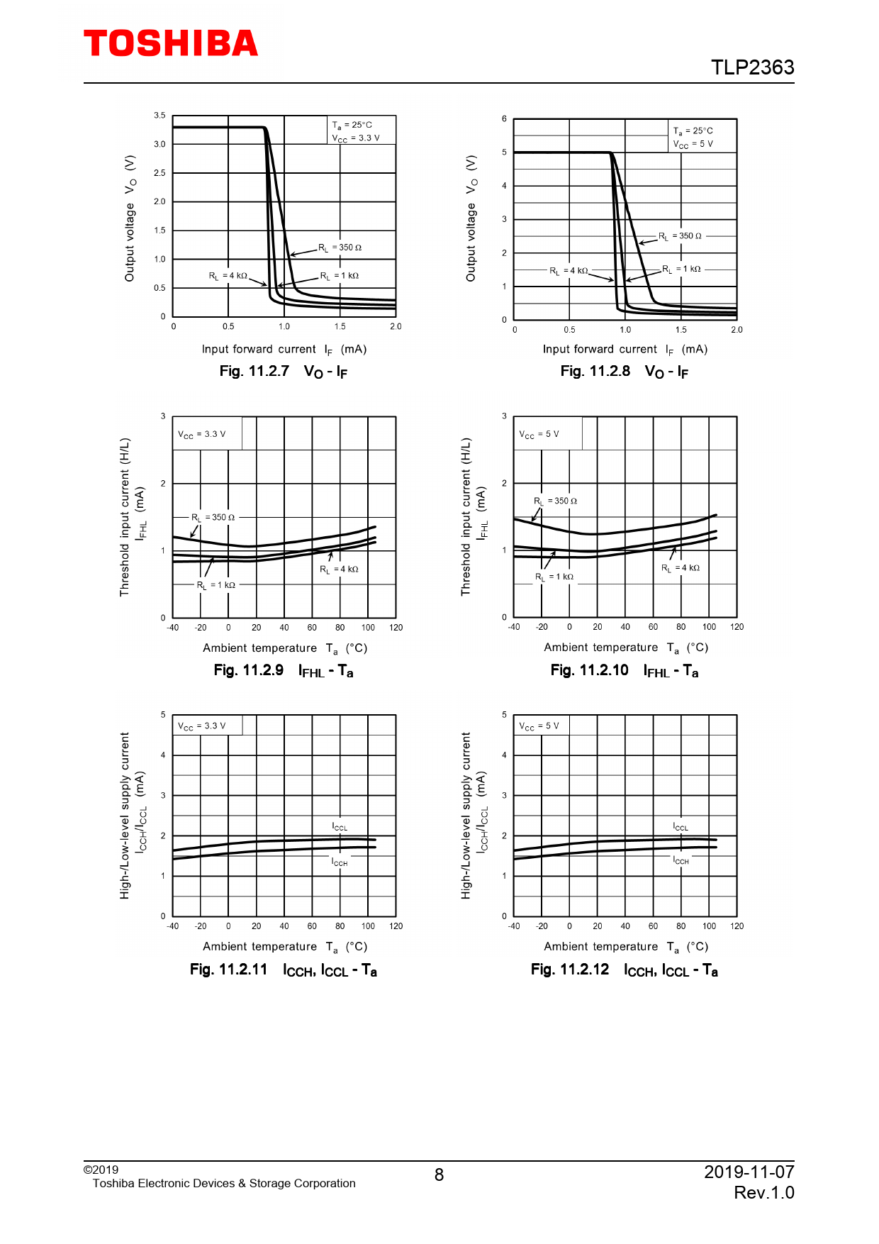 TLP2363. Fig. 11.2.7. VO. -. IF. Fig. 11.2.8. VO. -. IF. Fig. 11.2.9. IFHL. -. Ta. Fig. 11.2.10. IFHL. -. Ta. Fig. 11.2.11. ICCH,. ICCL. -. Ta. Fig. 11.2.12. ICCH,. ICCL. -. Ta. ©2019. 8