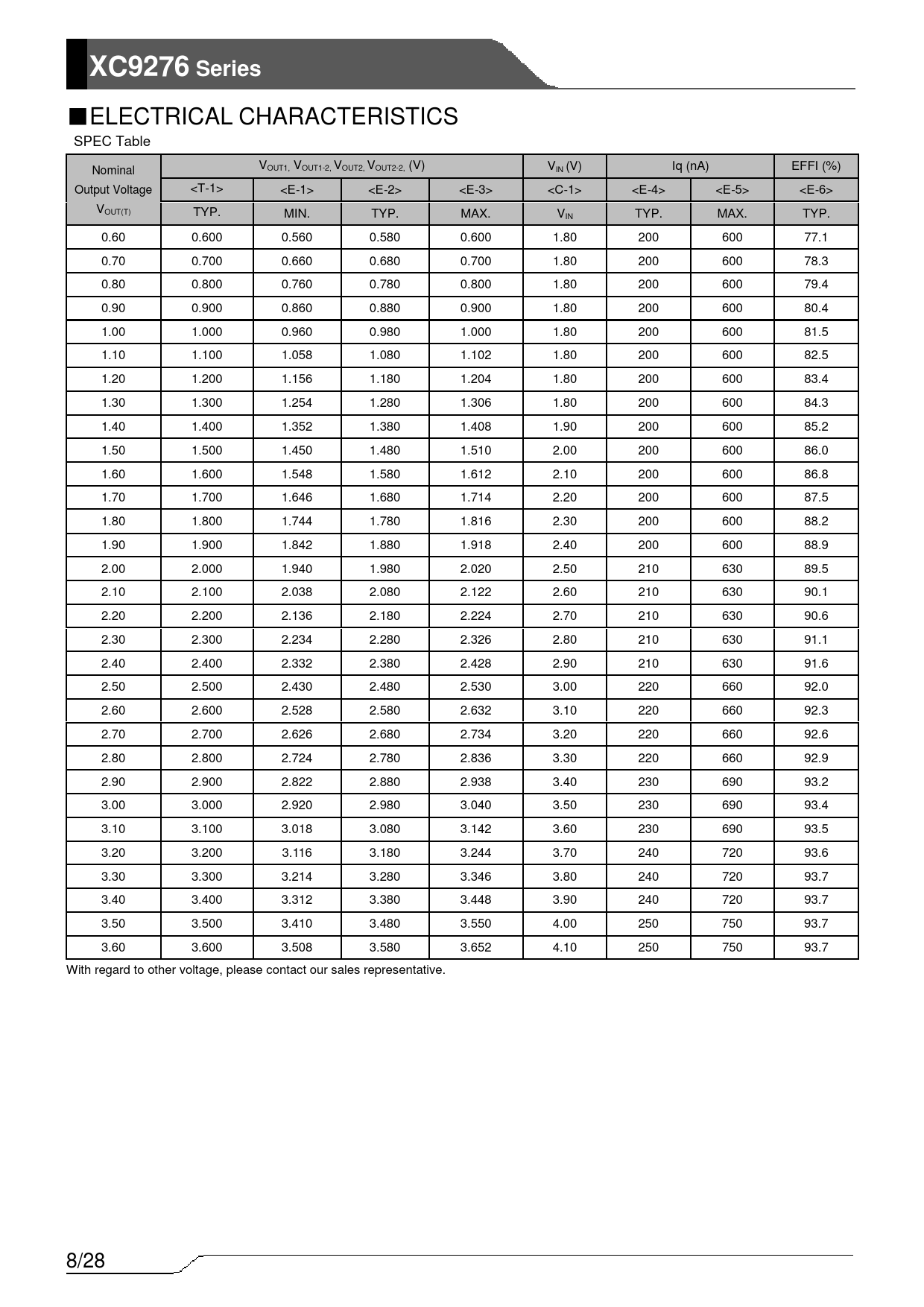■ELECTRICAL CHARACTERISTICS SPEC Table Nominal VOUT1, VOUT1-2, VOUT2, VOUT2-2, (V) VIN (V) Iq (nA) EFFI (%) Output Voltage <T-1> <E-1> <E-2> <E-3> <C-1> <E-4> <E-5> <E-6> VOUT(T) TYP. MIN. TYP. MAX. VIN TYP. MAX. TYP. 0.60 0.600 0.560 0.580 0.600 1.80 200 600 77.1 0.70 0.700 0.660 0.680 0.700 1.80 200 600 78.3 0.80 0.800 0.760 0.780 0.800 1.80 200 600 79.4 0.90 0.900 0.860 0.880 0.900 1.80 200 600 80.4 1.00 1.000 0.960 0.980 1.000 1.80 200 600 81.5 1.10 1.100 1.058 1.080 1.102 1.80 200 600 82.5 1.20 1.200 1.156 1.180 1.204 1.80 200 600 83.4 1.30 1.300 1.254 1.280 1.306 1.80 200 600 84.3 1.40 1.400 1.352 1.380 1.408 1.90 200 600 85.2 1.50 1.500 1.450 1.480 1.510 2.00 200 600 86.0 1.60 1.600 1.548 1.580 1.612 2.10 200 600 86.8 1.70 1.700 1.646 1.680 1.714 2.20 200 600 87.5 1.80 1.800 1.744 1.780 1.816 2.30 200 600 88.2 1.90 1.900 1.842 1.880 1.918 2.40 200 600 88.9 2.00 2.000 1.940 1.980 2.020 2.50 210 630 89.5 2.10 2.100 2.038 2.080 2.122 2.60 210 630 90.1 2.20 2.200 2.136 2.180 2.224 2.70 210 630 90.6 2.30 2.300 2.234 2.280 2.326 2.80 210 630 91.1 2.40 2.400 2.332 2.380 2.428 2.90 210 630 91.6 2.50 2.500 2.430 2.480 2.530 3.00 220 660 92.0 2.60 2.600 2.528 2.580 2.632 3.10 220 660 92.3 2.70 2.700 2.626 2.680 2.734 3.20 220 660 92.6 2.80 2.800 2.724 2.780 2.836 3.30 220 660 92.9 2.90 2.900 2.822 2.880 2.938 3.40 230 690 93.2 3.00 3.000 2.920 2.980 3.040 3.50 230 690 93.4 3.10 3.100 3.018 3.080 3.142 3.60 230 690 93.5 3.20 3.200 3.116 3.180 3.244 3.70 240 720 93.6 3.30 3.300 3.214 3.280 3.346 3.80 240 720 93.7 3.40 3.400 3.312 3.380 3.448 3.90 240 720 93.7 3.50 3.500 3.410 3.480 3.550 4.00 250 750 93.7 3.60 3.600 3.508 3.580 3.652 4.10 250 750 93.7 With regard to other voltage, please contact our sales representative. 8/28 Document Outline GRM188R61A106ME69 LMK107BBJ106MALT GRM188R61A106ME69 GRM188R60J226MEA0 GRM188R61A226ME15 GRM188R60J476ME15 LMK107BBJ106MALT JMK107BBJ226MA C1608X5R0J226M080AC