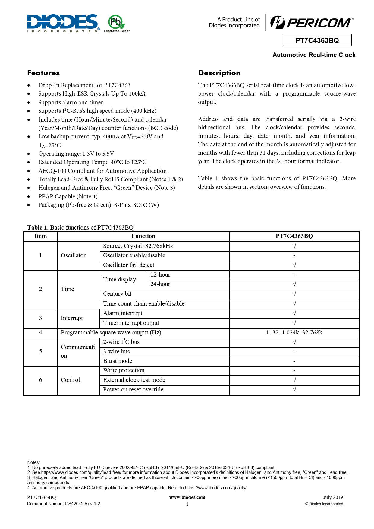 PT7C4363BQ. Automotive Real-time Clock. Features. Description. Table 1. Item. Function. www.diodes.com