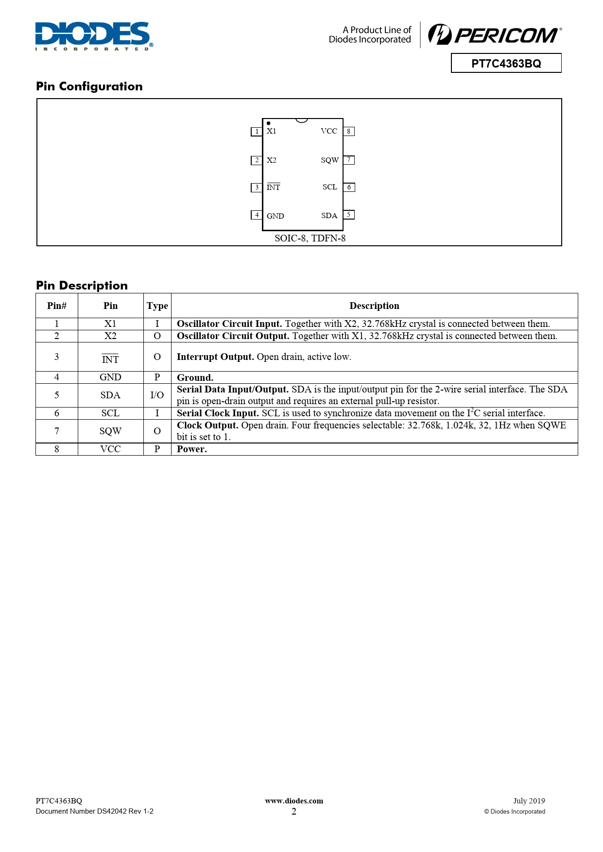 PT7C4363BQ. Pin Configuration. Pin Description. Pin#. Pin. Type. Description. Oscillator Circuit Input. Oscillator Circuit Output