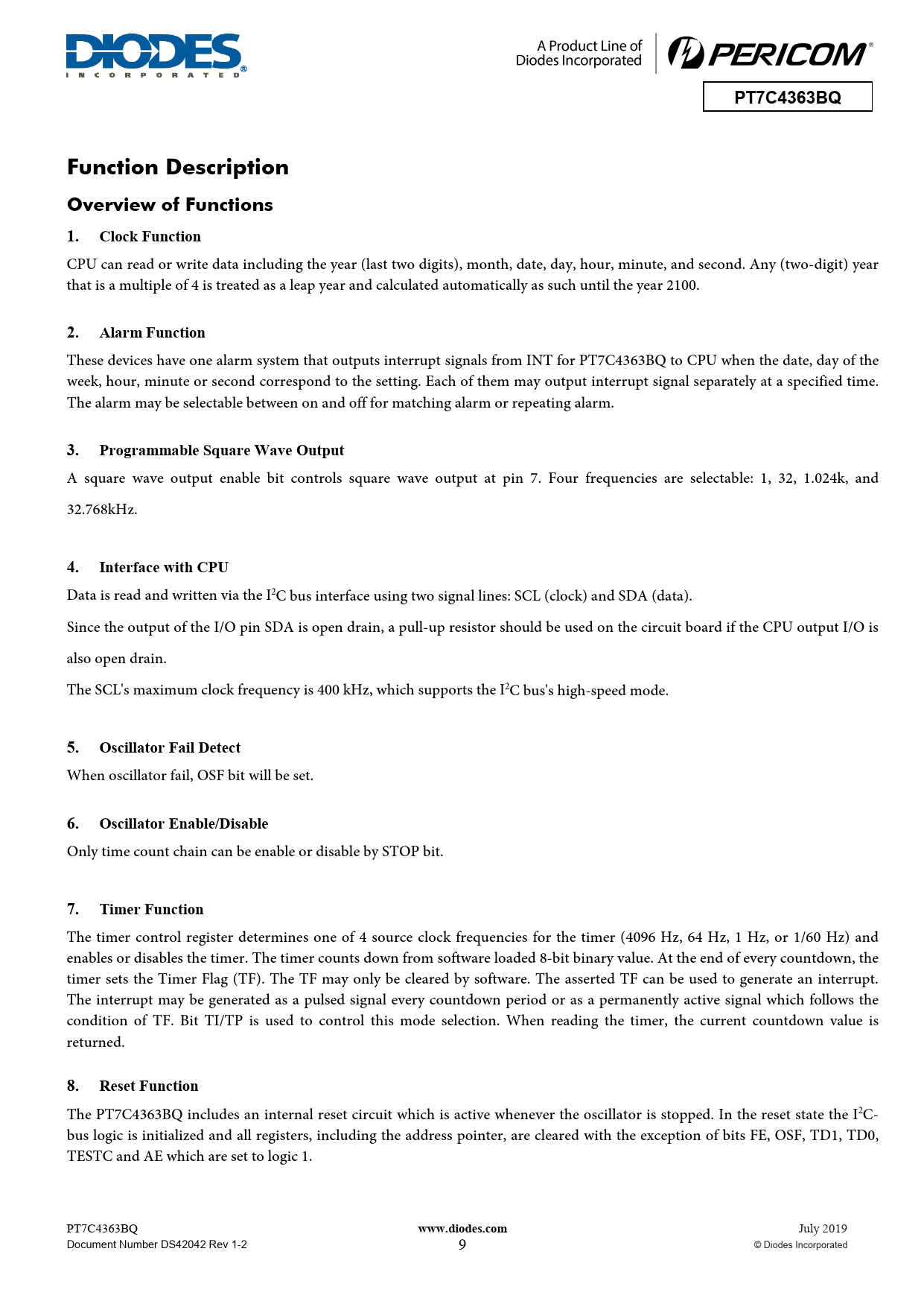 | Seiten / Seite | 23 / 9 — PT7C4363BQ. Function Description Overview of Functions 1. Clock Function. … |