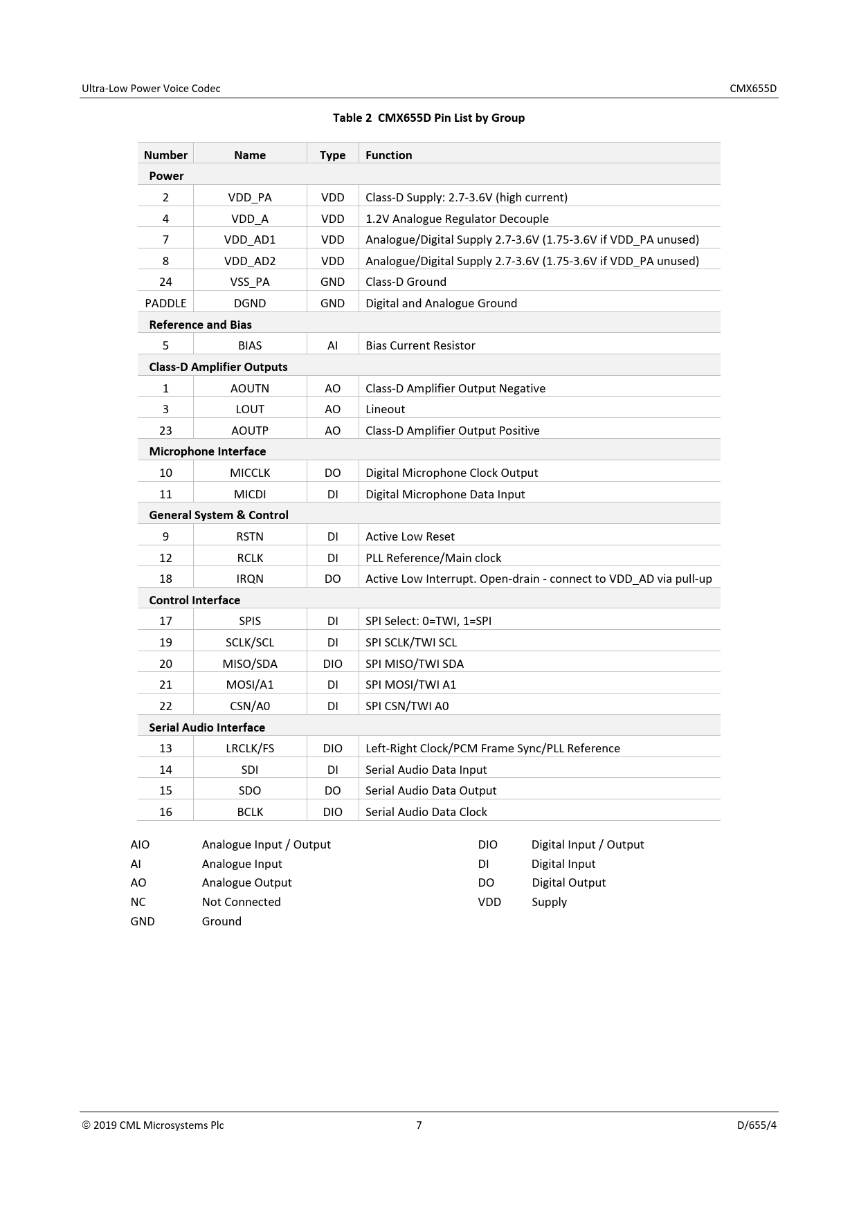Table 2 CMX655D Pin List by Group Number Name Type Function Power
