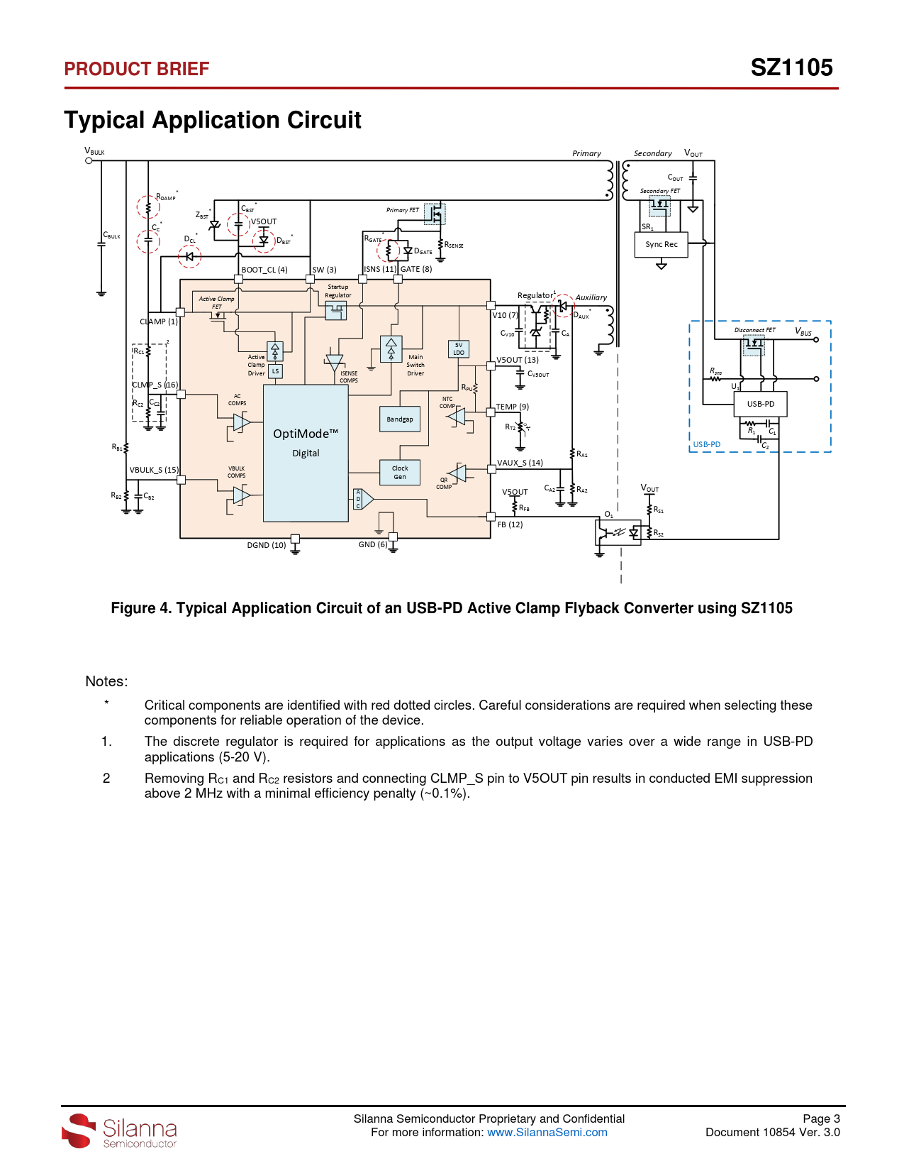 PRODUCT BRIEFSZ1105Typical Application Circuit VBULK Primary Secondary VOUT COUT Secondary FET R * DAMP C * BST * Primary FET ZBST * V5OUT CC SR1 CBULK * * DCL D * R BST GATE RSENSE Sync Rec DGATE BOOT_CL (4) SW (3) ISNS (11) GATE (8) Startup Regulator Active Clamp Regulator1 Auxiliary FET V10 (7) D * AUX CLAMP (1) C Disconnect FET V V10 CA BUS 2 5V RC1 LDO Active Main V5OUT (13) Clamp Switch LS Driver ISENSE Driver C R V5OUT sns CLMP_S (16) COMPS R U PU 1 AC NTC R CC2 COMPS C2 OptiM COMP TEMP (9) USB-PD Bandgap R 0 t OptiMode T2 - R1 C1 R USB-PD C B1 2 Digital RA1 VAUX_S (14) VBULK_S (15) VBULK Clock COMPS Gen QR COMP CA2 R VOUT R A2 B2 CB2 PulseLink A V5OUT D Encoder/Decoder C RFB RS1 O1 FB (12) RS2 DGND (10) GND (6) Figure 4. Typical Application Circuit of an USB-PD Active Clamp Flyback Converter using SZ1105 Notes: * Critical components are identified with red dotted circles. Careful considerations are required when selecting these components for reliable operation of the device. 1. The discrete regulator is required for applications as the output voltage varies over a wide range in USB-PD applications (5-20 V). 2 Removing RC1 and RC2 resistors and connecting CLMP_S pin to V5OUT pin results in conducted EMI suppression above 2 MHz with a minimal efficiency penalty (~0.1%). Silanna Semiconductor Proprietary and Confidential Page 3 For more information: www.SilannaSemi.com Document 10854 Ver. 3.0