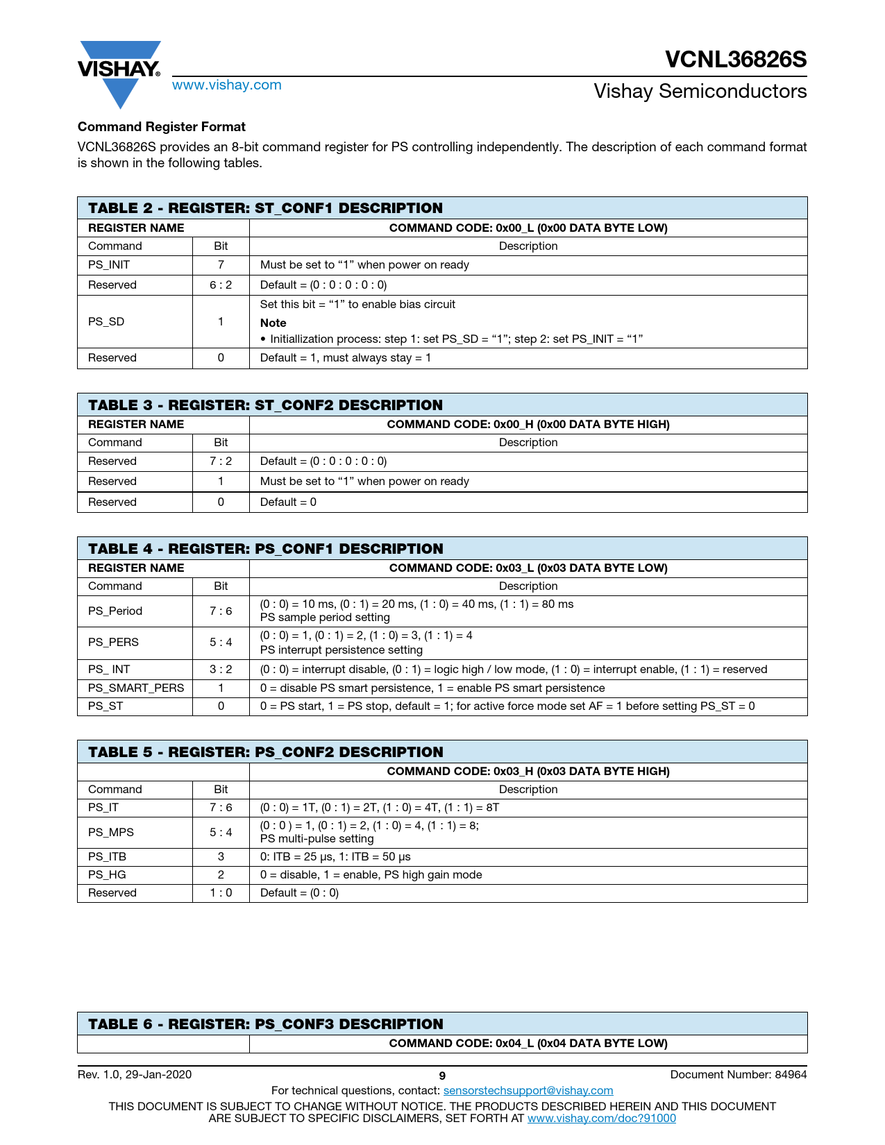 VCNL36826S. Command Register Format. TABLE 2 - REGISTER: ST_CONF1 DESCRIPTION REGISTER NAME