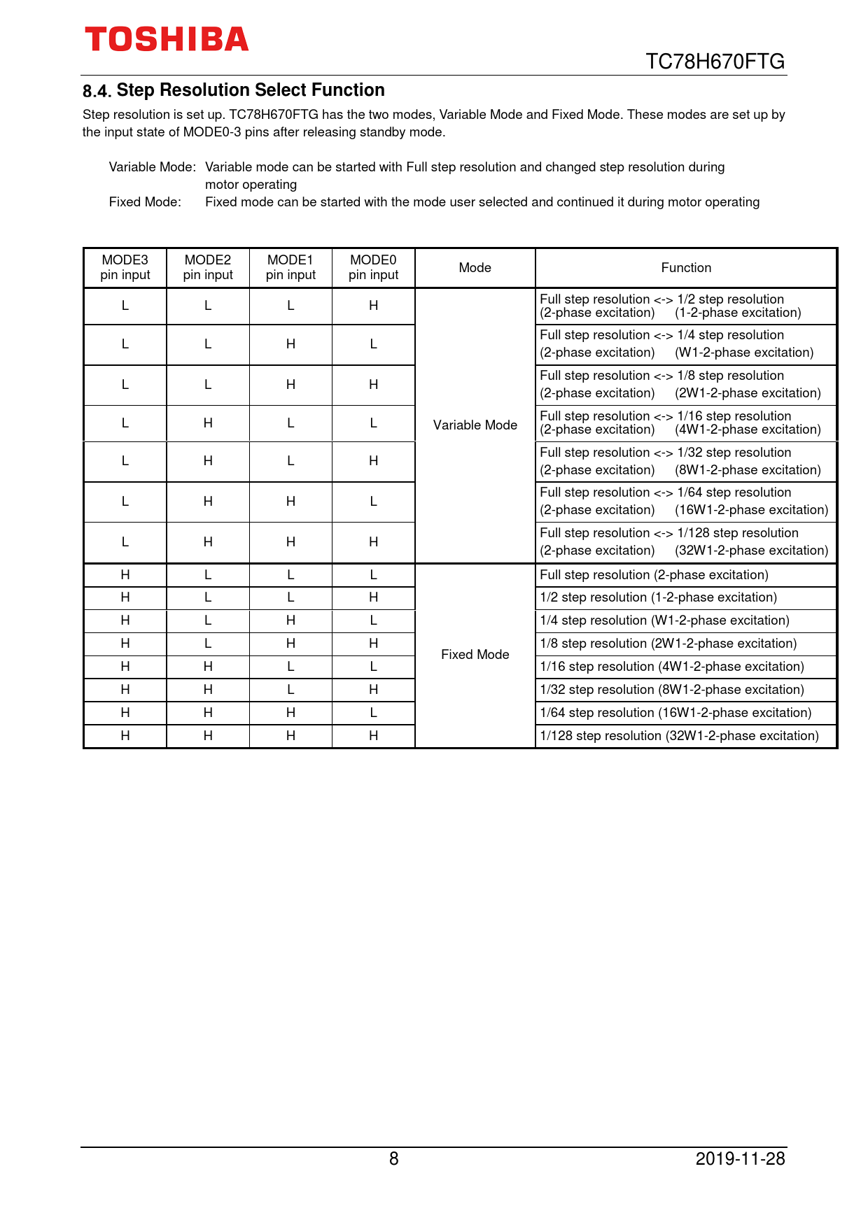 TC78H670FTG Step Resolution Select Function Step resolution is set up. TC78H670FTG has the two modes, Variable Mode and Fixed Mode. These modes are set up by the input state of MODE0-3 pins after releasing standby mode. Variable Mode: Variable mode can be started with Full step resolution and changed step resolution during motor operating Fixed Mode: Fixed mode can be started with the mode user selected and continued it during motor operating MODE3 MODE2 MODE1 MODE0 Mode Function pin input pin input pin input pin input Full step resolution <-> 1/2 step resolution L L L H (2-phase excitation) (1-2-phase excitation) Full step resolution <-> 1/4 step resolution L L H L (2-phase excitation) (W1-2-phase excitation) Full step resolution <-> 1/8 step resolution L L H H (2-phase excitation) (2W1-2-phase excitation) Full step resolution <-> 1/16 step resolution L H L L Variable Mode (2-phase excitation) (4W1-2-phase excitation) Full step resolution <-> 1/32 step resolution L H L H (2-phase excitation) (8W1-2-phase excitation) Full step resolution <-> 1/64 step resolution L H H L (2-phase excitation) (16W1-2-phase excitation) Full step resolution <-> 1/128 step resolution L H H H (2-phase excitation) (32W1-2-phase excitation) H L L L Full step resolution (2-phase excitation) H L L H 1/2 step resolution (1-2-phase excitation) H L H L 1/4 step resolution (W1-2-phase excitation) H L H H 1/8 step resolution (2W1-2-phase excitation) Fixed Mode H H L L 1/16 step resolution (4W1-2-phase excitation) H H L H 1/32 step resolution (8W1-2-phase excitation) H H H L 1/64 step resolution (16W1-2-phase excitation) H H H H 1/128 step resolution (32W1-2-phase excitation) 8 2019-11-28
