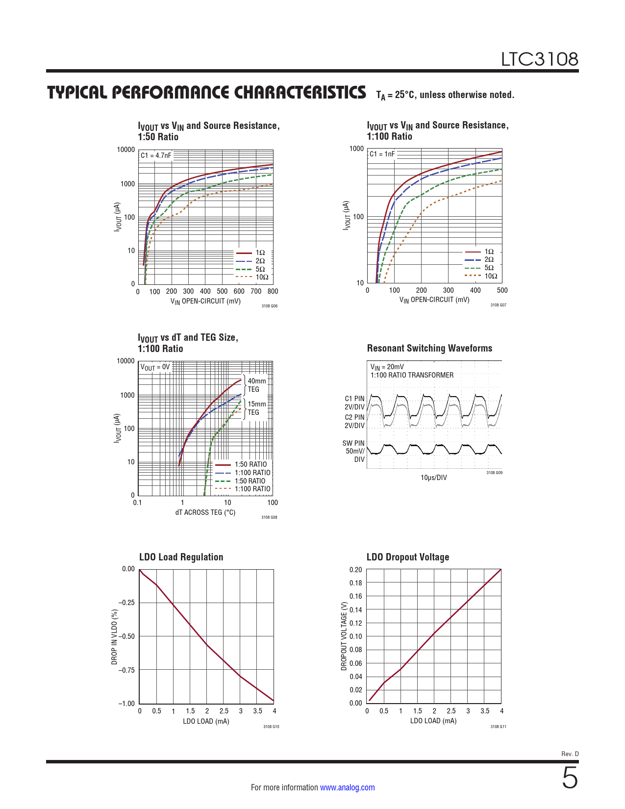 10000 VOUT = 0V VIN = 20mV 1:100 RATIO TRANSFORMER 40mm TEG 1000 C1 PIN 15mm 2V/DIV TEG C2 PIN (µA) 100 2V/DIV I VOUT SW PIN 50mV/ 10 DIV 1:50 RATIO 1:100 RATIO 3108 G09 1:50 RATIO 10µs/DIV 1:100 RATIO 00.1 1 10 100 dT ACROSS TEG (°C) 3108 G08