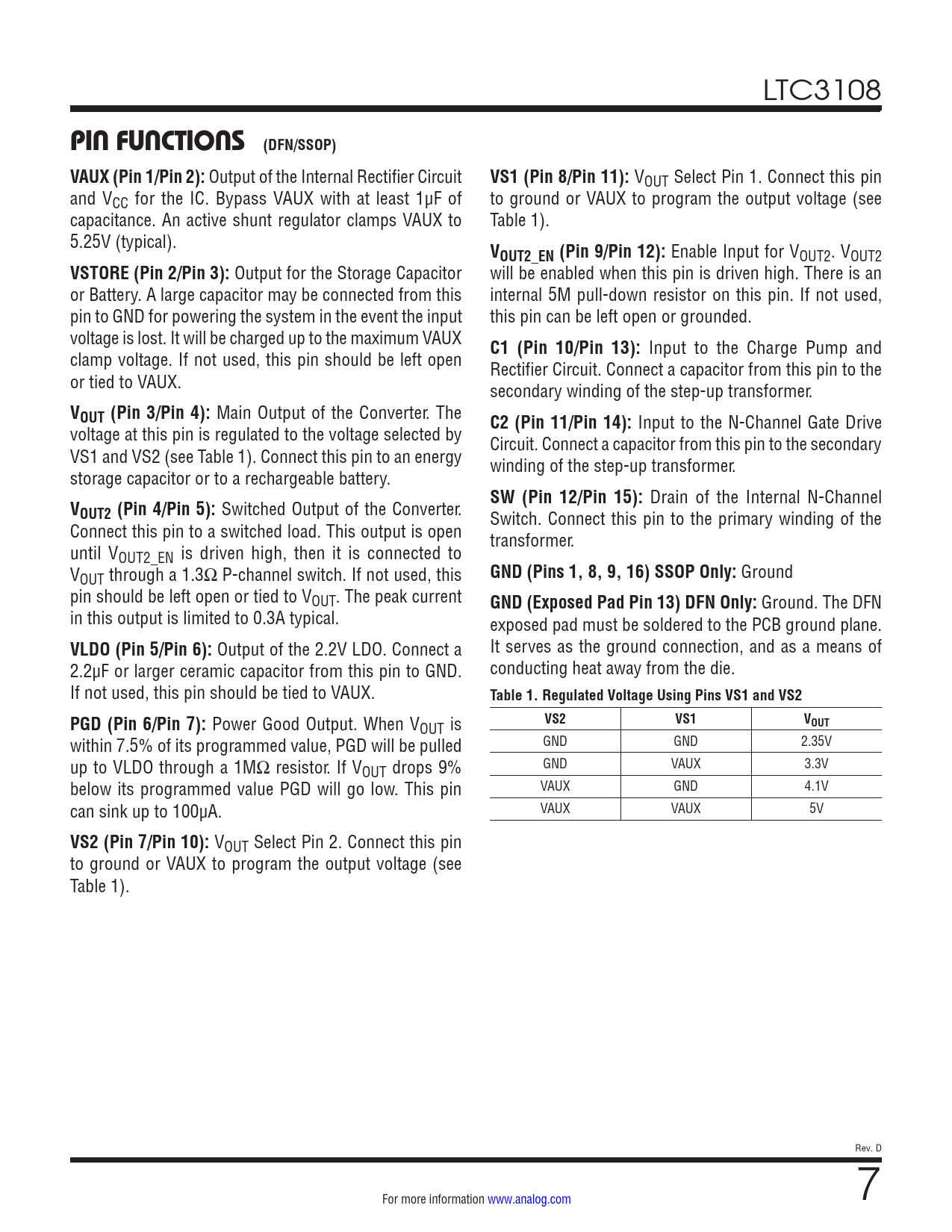 link to page 7 link to page 7 link to page 7 LTC3108 PIN FUNCTIONS (DFN/SSOP) VAUX (Pin 1/Pin 2): Output of the Internal Rectifier Circuit VS1 (Pin 8/Pin 11): VOUT Select Pin 1. Connect this pin and VCC for the IC. Bypass VAUX with at least 1µF of to ground or VAUX to program the output voltage (see capacitance. An active shunt regulator clamps VAUX to Table 1). 5.25V (typical). VOUT2_EN (Pin 9/Pin 12): Enable Input for VOUT2. VOUT2 VSTORE (Pin 2/Pin 3): Output for the Storage Capacitor will be enabled when this pin is driven high. There is an or Battery. A large capacitor may be connected from this internal 5M pull-down resistor on this pin. If not used, pin to GND for powering the system in the event the input this pin can be left open or grounded. voltage is lost. It will be charged up to the maximum VAUX C1 (Pin 10/Pin 13): Input to the Charge Pump and clamp voltage. If not used, this pin should be left open Rectifier Circuit. Connect a capacitor from this pin to the or tied to VAUX. secondary winding of the step-up transformer. VOUT (Pin 3/Pin 4): Main Output of the Converter. The C2 (Pin 11/Pin 14): Input to the N-Channel Gate Drive voltage at this pin is regulated to the voltage selected by Circuit. Connect a capacitor from this pin to the secondary VS1 and VS2 (see Table 1). Connect this pin to an energy winding of the step-up transformer. storage capacitor or to a rechargeable battery. SW (Pin 12/Pin 15): Drain of the Internal N-Channel VOUT2 (Pin 4/Pin 5): Switched Output of the Converter. Switch. Connect this pin to the primary winding of the Connect this pin to a switched load. This output is open transformer. until VOUT2_EN is driven high, then it is connected to VOUT through a 1.3Ω P-channel switch. If not used, this GND (Pins 1, 8, 9, 16) SSOP Only: Ground pin should be left open or tied to VOUT. The peak current GND (Exposed Pad Pin 13) DFN Only: Ground. The DFN in this output is limited to 0.3A typical. exposed pad must be soldered to the PCB ground plane. VLDO (Pin 5/Pin 6): Output of the 2.2V LDO. Connect a It serves as the ground connection, and as a means of 2.2µF or larger ceramic capacitor from this pin to GND. conducting heat away from the die. If not used, this pin should be tied to VAUX. Table 1. Regulated Voltage Using Pins VS1 and VS2PGD (Pin 6/Pin 7): Power Good Output. When V VS2VS1V OUT is OUT within 7.5% of its programmed value, PGD will be pulled GND GND 2.35V up to VLDO through a 1MΩ resistor. If VOUT drops 9% GND VAUX 3.3V below its programmed value PGD will go low. This pin VAUX GND 4.1V can sink up to 100µA. VAUX VAUX 5V VS2 (Pin 7/Pin 10): VOUT Select Pin 2. Connect this pin to ground or VAUX to program the output voltage (see Table 1). Rev. D For more information www.analog.com 7 Document Outline Features Applications Typical Application Description Absolute Maximum Ratings Pin Configuration Order Information Electrical Characteristics Typical Performance Characteristics Pin Functions Block Diagram Operation Applications Information Typical Applications Package Description Revision History Typical Application Related Parts