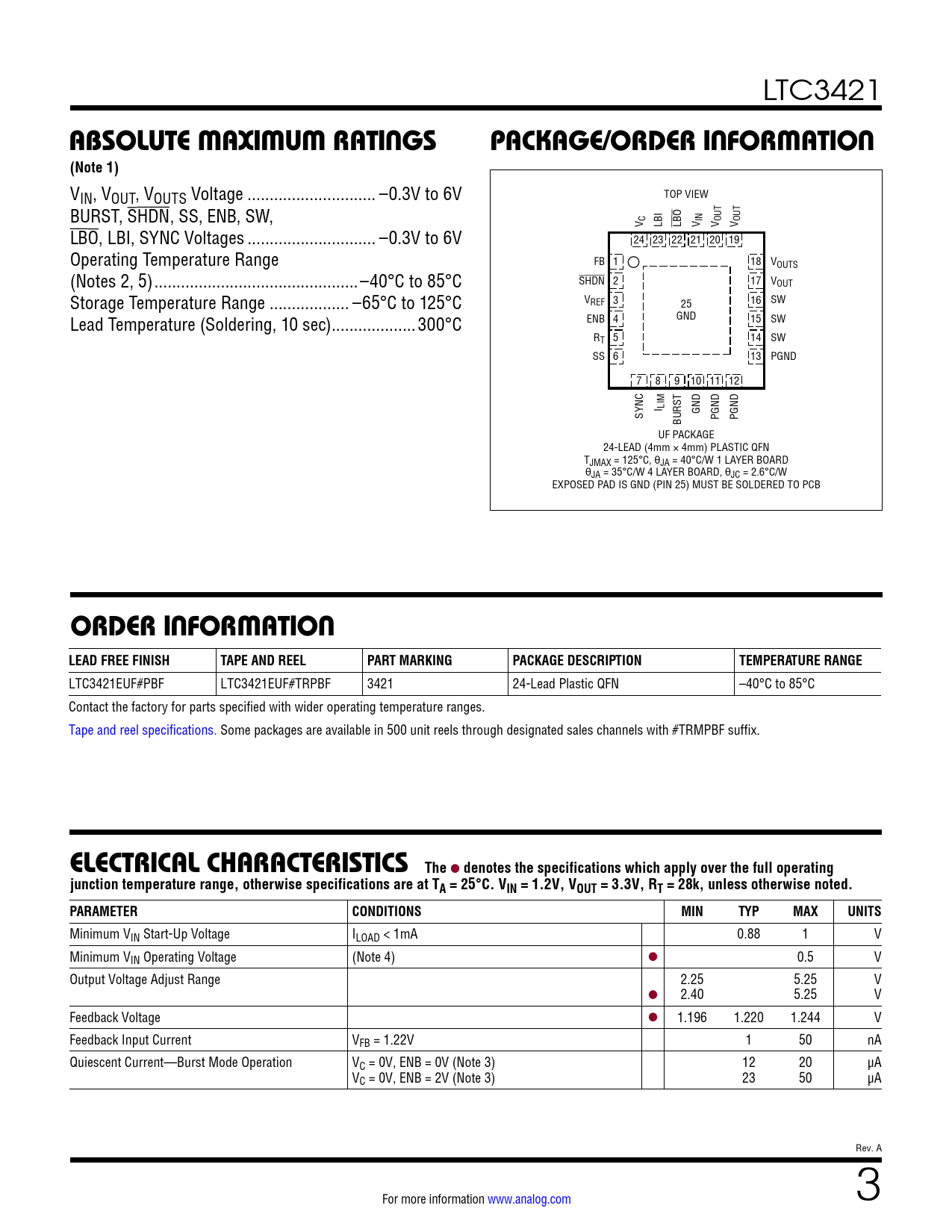 LTC3421EUF#PBF LTC3421EUF#TRPBF 3421 24-Lead Plastic QFN –40°C to 85°C Contact the factory for parts specified with wider operating temperature ranges. Tape and reel specifications. Some packages are available in 500 unit reels through designated sales channels with #TRMPBF suffix.
