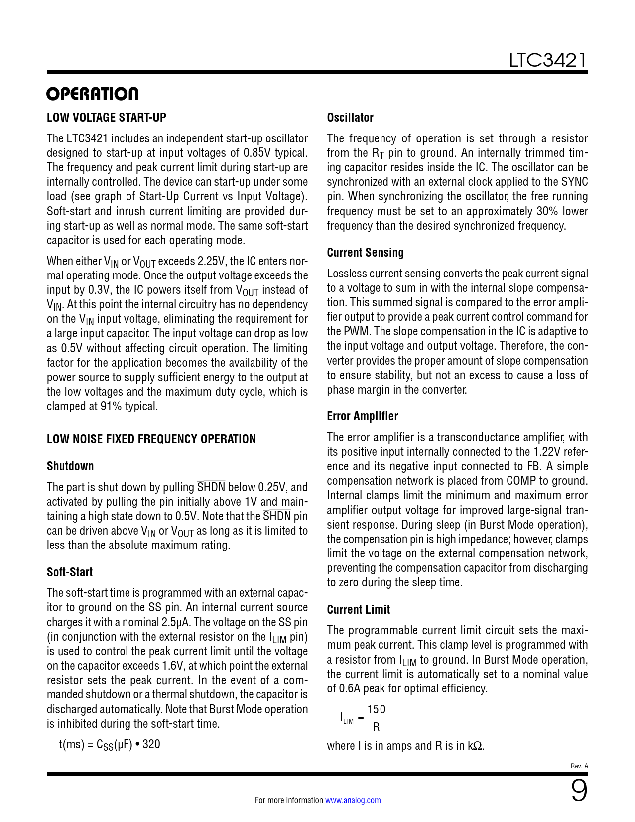 LTC3421 OPERATIONLOW VOLTAGE START-UPOscillator The LTC3421 includes an independent start-up oscillator The frequency of operation is set through a resistor designed to start-up at input voltages of 0.85V typical. from the RT pin to ground. An internally trimmed tim- The frequency and peak current limit during start-up are ing capacitor resides inside the IC. The oscillator can be internally controlled. The device can start-up under some synchronized with an external clock applied to the SYNC load (see graph of Start-Up Current vs Input Voltage). pin. When synchronizing the oscillator, the free running Soft-start and inrush current limiting are provided dur- frequency must be set to an approximately 30% lower ing start-up as well as normal mode. The same soft-start frequency than the desired synchronized frequency. capacitor is used for each operating mode. Current Sensing When either VIN or VOUT exceeds 2.25V, the IC enters nor- mal operating mode. Once the output voltage exceeds the Lossless current sensing converts the peak current signal input by 0.3V, the IC powers itself from VOUT instead of to a voltage to sum in with the internal slope compensa- VIN. At this point the internal circuitry has no dependency tion. This summed signal is compared to the error ampli- on the VIN input voltage, eliminating the requirement for fier output to provide a peak current control command for a large input capacitor. The input voltage can drop as low the PWM. The slope compensation in the IC is adaptive to as 0.5V without affecting circuit operation. The limiting the input voltage and output voltage. Therefore, the con- factor for the application becomes the availability of the verter provides the proper amount of slope compensation power source to supply sufficient energy to the output at to ensure stability, but not an excess to cause a loss of the low voltages and the maximum duty cycle, which is phase margin in the converter. clamped at 91% typical. Error AmplifierLOW NOISE FIXED FREQUENCY OPERATION The error amplifier is a transconductance amplifier, with its positive input internally connected to the 1.22V refer- Shutdown ence and its negative input connected to FB. A simple The part is shut down by pulling SHDN below 0.25V, and compensation network is placed from COMP to ground. activated by pulling the pin initially above 1V and main- Internal clamps limit the minimum and maximum error taining a high state down to 0.5V. Note that the SHDN pin amplifier output voltage for improved large-signal tran- can be driven above V sient response. During sleep (in Burst Mode operation), IN or VOUT as long as it is limited to less than the absolute maximum rating. the compensation pin is high impedance; however, clamps limit the voltage on the external compensation network, Soft-Start preventing the compensation capacitor from discharging to zero during the sleep time. The soft-start time is programmed with an external capac- itor to ground on the SS pin. An internal current source Current Limit charges it with a nominal 2.5µA. The voltage on the SS pin (in conjunction with the external resistor on the I The programmable current limit circuit sets the maxi- LIM pin) is used to control the peak current limit until the voltage mum peak current. This clamp level is programmed with on the capacitor exceeds 1.6V, at which point the external a resistor from ILIM to ground. In Burst Mode operation, resistor sets the peak current. In the event of a com- the current limit is automatically set to a nominal value manded shutdown or a thermal shutdown, the capacitor is of 0.6A peak for optimal efficiency. discharged automatically. Note that Burst Mode operation 150 is inhibited during the soft-start time. I LIM = R t(ms) = CSS(µF) • 320 where I is in amps and R is in kΩ. Rev. A For more information www.analog.com 9 Document Outline Description Typical Application Absolute Maximum Ratings Electrical Characteristics Typical Performance Characteristics Pin Functions Block Diagram Operation Package Description Typical Application Related Parts Features Applications Typical Application Description Absolute Maximum Ratings Order Information Electrical Characteristics Package/Order Information Electrical Characteristics Typical Performance Characteristics Pin Functions Block Diagram Operation Low Voltage Start-Up Low Noise Fixed Frequency Operation Burst Mode Operation Output Disconnect and Inrush Limiting Applications Information Component Selection Typical Application Package Description Revision History Typical Application Related Parts