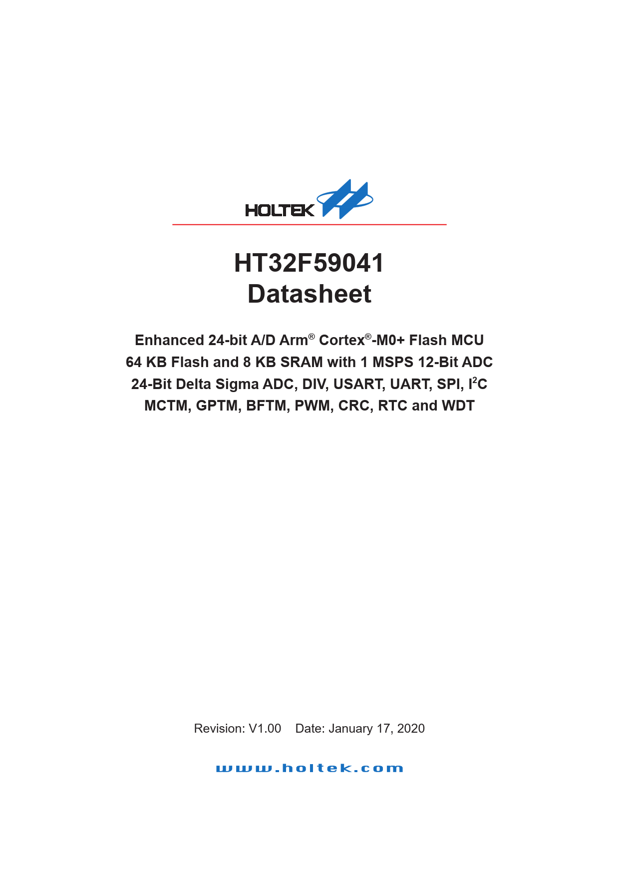 HT32F59041. Datasheet. Enhanced 24-bit A/D Arm® Cortex®-M0+ Flash MCU. 64 KB Flash and 8 KB SRAM with 1 MSPS 12-Bit ADC