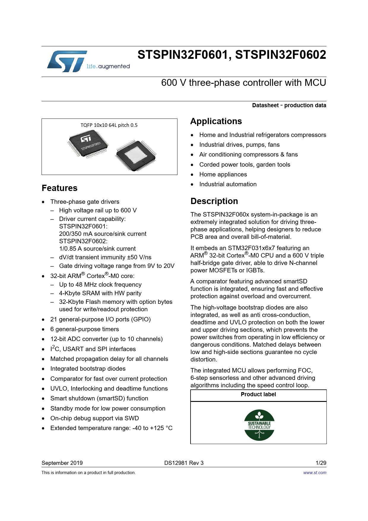 STSPIN32F0601, STSPIN32F0602. Datasheet. production data. Applications. Features. Description. Product label