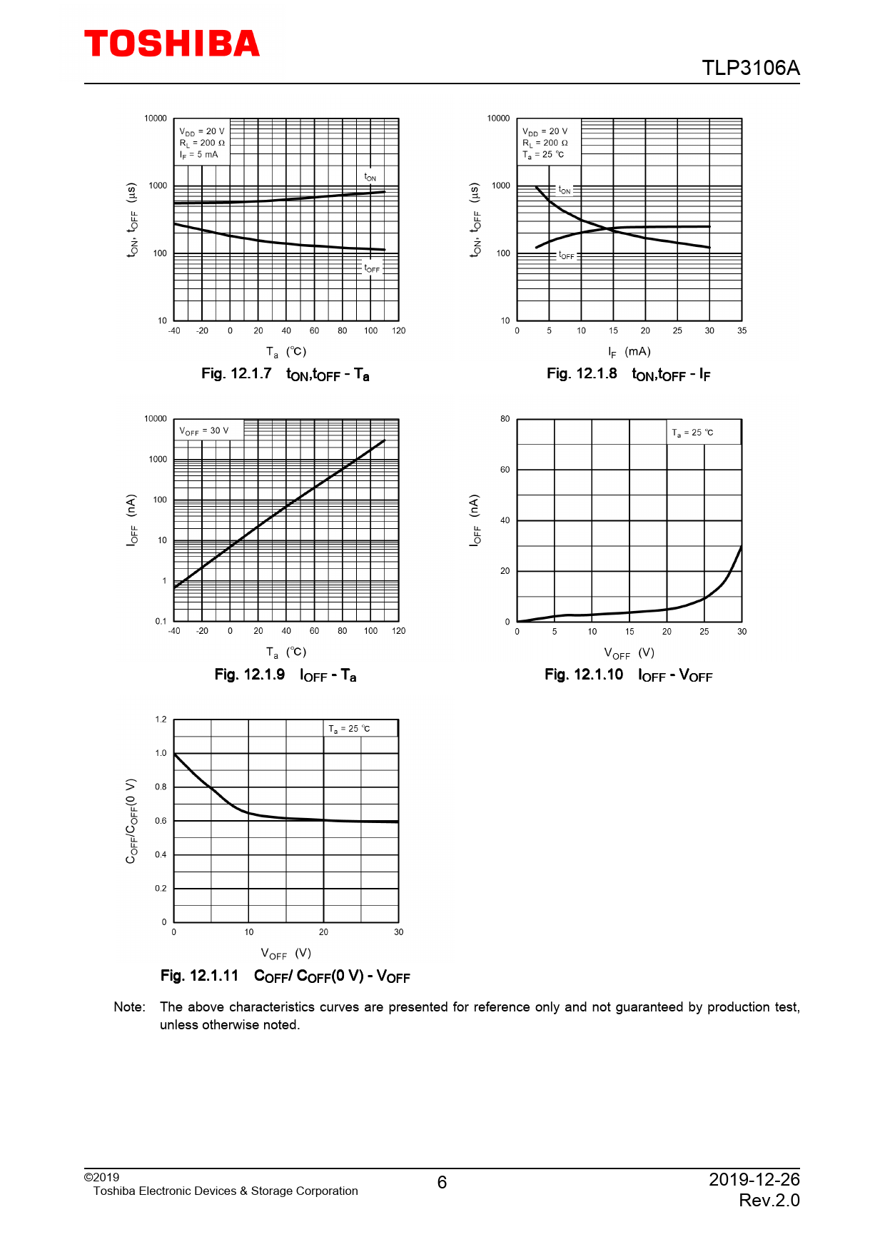 TLP3106A. Fig. 12.1.7. tON,tOFF. -. Ta. Fig. 12.1.8. tON,tOFF. -. IF. Fig. 12.1.9. IOFF. -. Ta. Fig. 12.1.10. IOFF. -. VOFF. Fig. 12.1.11. COFF/. COFF(0. V). -. VOFF. Note:. The