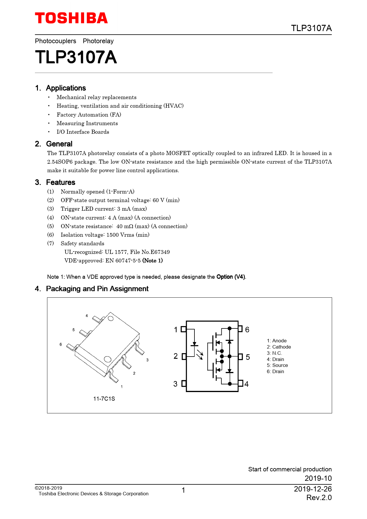 TLP3107A Photocouplers Photorelay TLP3107A 1. Applications • Mechanical relay replacements • Heating, ventilation and air conditioning (HVAC) • Factory Automation (FA) • Measuring Instruments • I/O Interface Boards 2. General The TLP3107A photorelay consists of a photo MOSFET optically coupled to an infrared LED. It is housed in a 2.54SOP6 package. The low ON-state resistance and the high permissible ON-state current of the TLP3107A make it suitable for power line control applications. 3. Features (1) Normally opened (1-Form-A) (2) OFF-state output terminal voltage: 60 V (min) (3) Trigger LED current: 3 mA (max) (4) ON-state current: 4 A (max) (A connection) (5) ON-state resistance: 40 mΩ (max) (A connection) (6) Isolation voltage: 1500 Vrms (min) (7) Safety standards UL-recognized: UL 1577, File No.E67349 VDE-approved: EN 60747-5-5 (Note 1) Note 1: When a VDE approved type is needed, please designate the Option (V4). 4. Packaging and Pin Assignment 1: Anode 2: Cathode 3: N.C. 4: Drain 5: Source 6: Drain 11-7C1S Start of commercial production 2019-10 ©2018-2019 1 2019-12-26 Toshiba Electronic Devices & Storage Corporation Rev.2.0