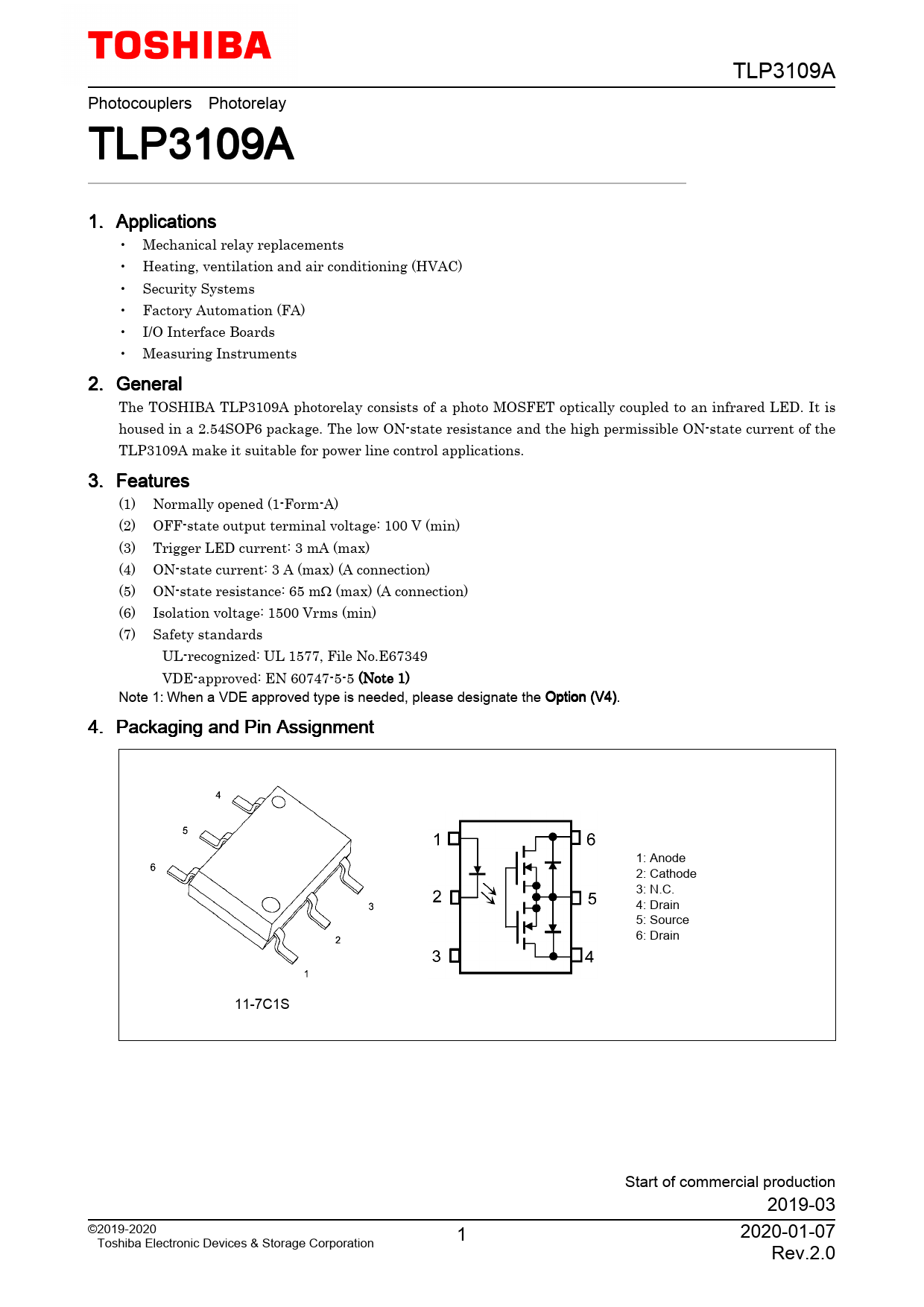 TLP3109A. Photocouplers. Photorelay. TLP3109A. 1. Applications. •. Mechanical. relay. replacements. •. Heating,. ventilation. and. air. conditioning