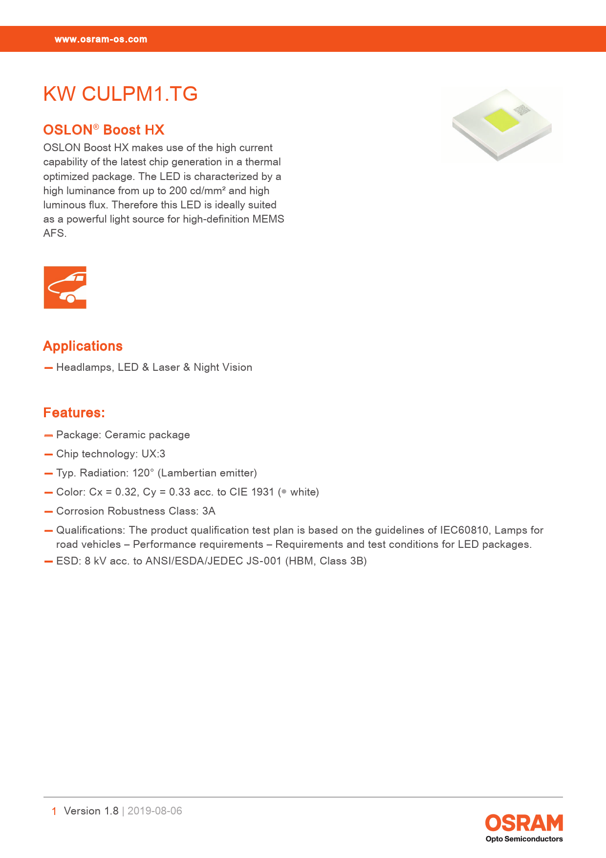 Produktdatenblatt | Version 1.1 www.osram-os.com KW CULPM1.TG KW CULPM1.TG OSLON® Boost HX OSLON Boost HX makes use of the high current capability of the latest chip generation in a thermal optimized package. The LED is characterized by a high luminance from up to 200 cd/mm² and high luminous flux. Therefore this LED is ideally suited as a powerful light source for high-definition MEMS AFS. Applications — Headlamps, LED & Laser & Night Vision Features: — Package: Ceramic package — Chip technology: UX:3 — Typ. Radiation: 120° (Lambertian emitter) — Color: Cx = 0.32, Cy = 0.33 acc. to CIE 1931 (● white) — Corrosion Robustness Class: 3A — Qualifications: The product qualification test plan is based on the guidelines of IEC60810, Lamps for road vehicles – Performance requirements – Requirements and test conditions for LED packages. — ESD: 8 kV acc. to ANSI/ESDA/JEDEC JS-001 (HBM, Class 3B) 1 Version 1.8 | 2019-08-06