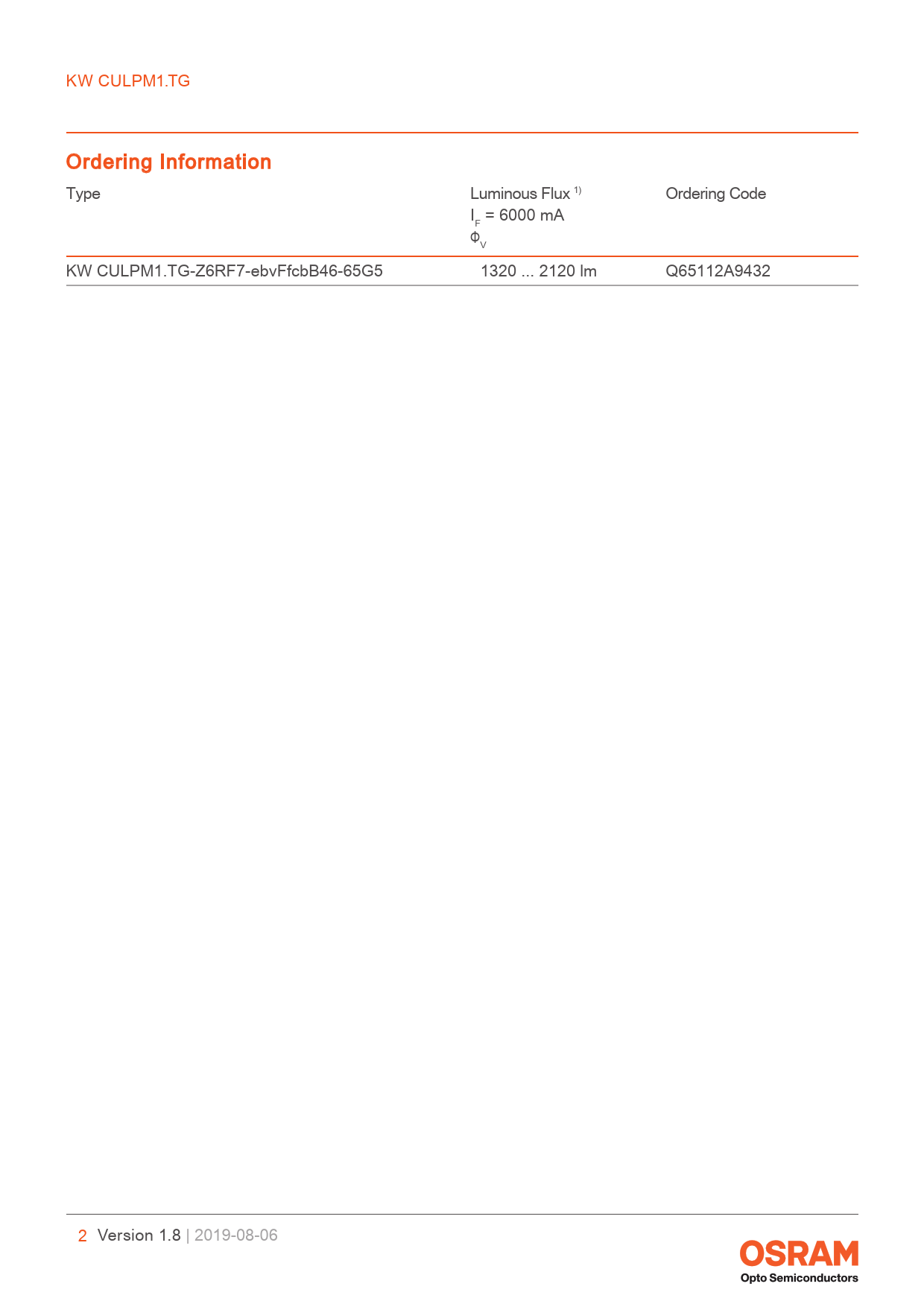 link. to. page. 23. KW. CULPM1.TG. Ordering. Information. Type. Luminous. Flux. 1). Ordering. Code. I. =. 6000. mA. F. ΦV. KW. CULPM1.TG-Z6RF7-ebvFfcbB46-65G5
