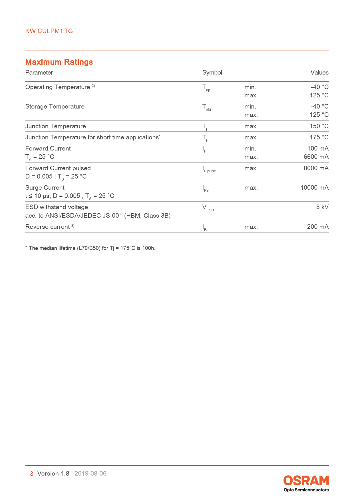 link to page 23 link to page 23 KW CULPM1.TG Maximum Ratings Parameter Symbol Values Operating Temperature 2) T min. -40 °C op max. 125 °C Storage Temperature T min. -40 °C stg max. 125 °C Junction Temperature T max. 150 °C j Junction Temperature for short time applications* T max. 175 °C j Forward Current I min. 100 mA F T = 25 °C max. 6600 mA S Forward Current pulsed I max. 8000 mA F pulse D = 0.005 ; T = 25 °C S Surge Current I max. 10000 mA FS t ≤ 10 µs; D = 0.005 ; T = 25 °C S ESD withstand voltage V 8 kV ESD acc. to ANSI/ESDA/JEDEC JS-001 (HBM, Class 3B) Reverse current 3) I max. 200 mA R * The median lifetime (L70/B50) for Tj = 175°C is 100h. 3 Version 1.8 | 2019-08-06