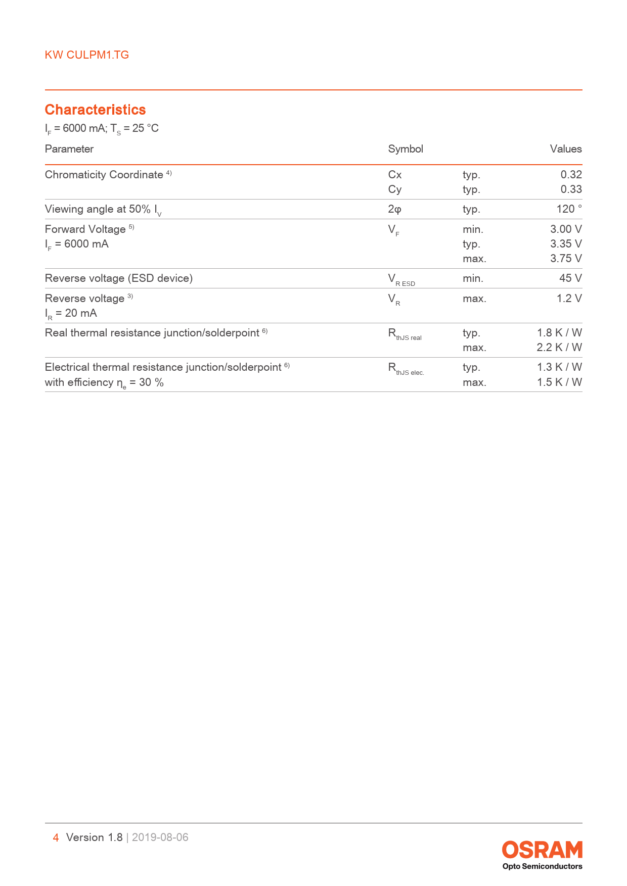 link to page 23 link to page 23 link to page 23 link to page 23 link to page 23 KW CULPM1.TG Characteristics I = 6000 mA; T = 25 °C F S Parameter Symbol Values Chromaticity Coordinate 4) Cx typ. 0.32 Cy typ. 0.33 Viewing angle at 50% I 2φ typ. 120 ° V Forward Voltage 5) V min. 3.00 V F I = 6000 mA typ. 3.35 V F max. 3.75 V Reverse voltage (ESD device) V min. 45 V R ESD Reverse voltage 3) V max. 1.2 V R I = 20 mA R Real thermal resistance junction/solderpoint 6) R typ. 1.8 K / W thJS real max. 2.2 K / W Electrical thermal resistance junction/solderpoint 6) R typ. 1.3 K / W thJS elec. with efficiency η = 30 % max. 1.5 K / W e 4 Version 1.8 | 2019-08-06